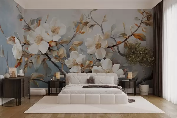 Фотошпалери Білі квіти з жовтими маточками на гілці дерева з листям, світле тло, вінтажний стиль живопису, фактурний принт w09368