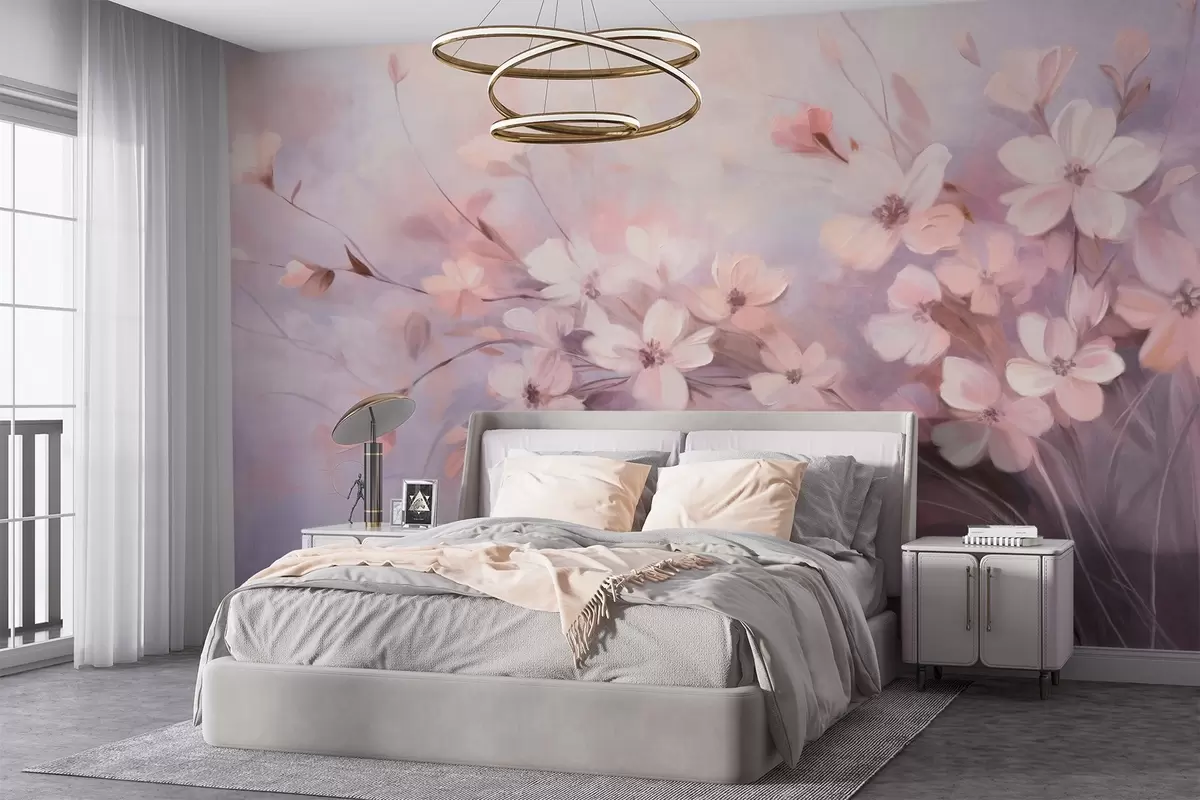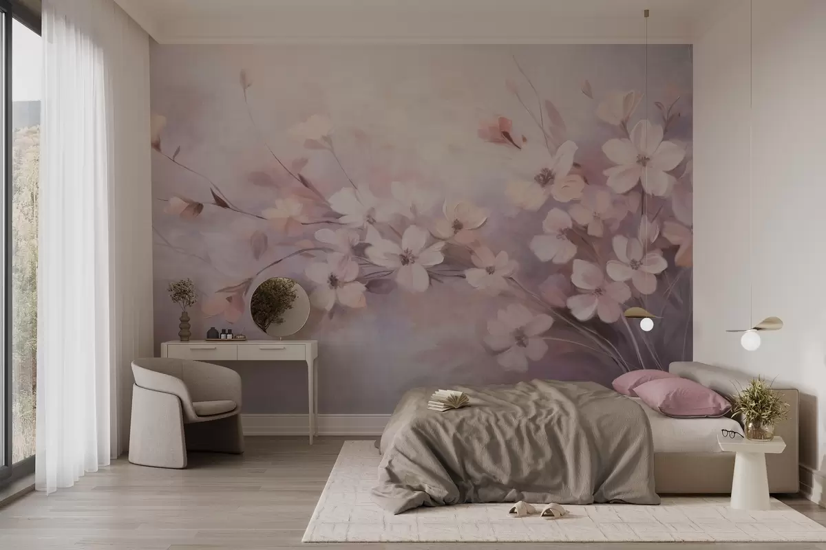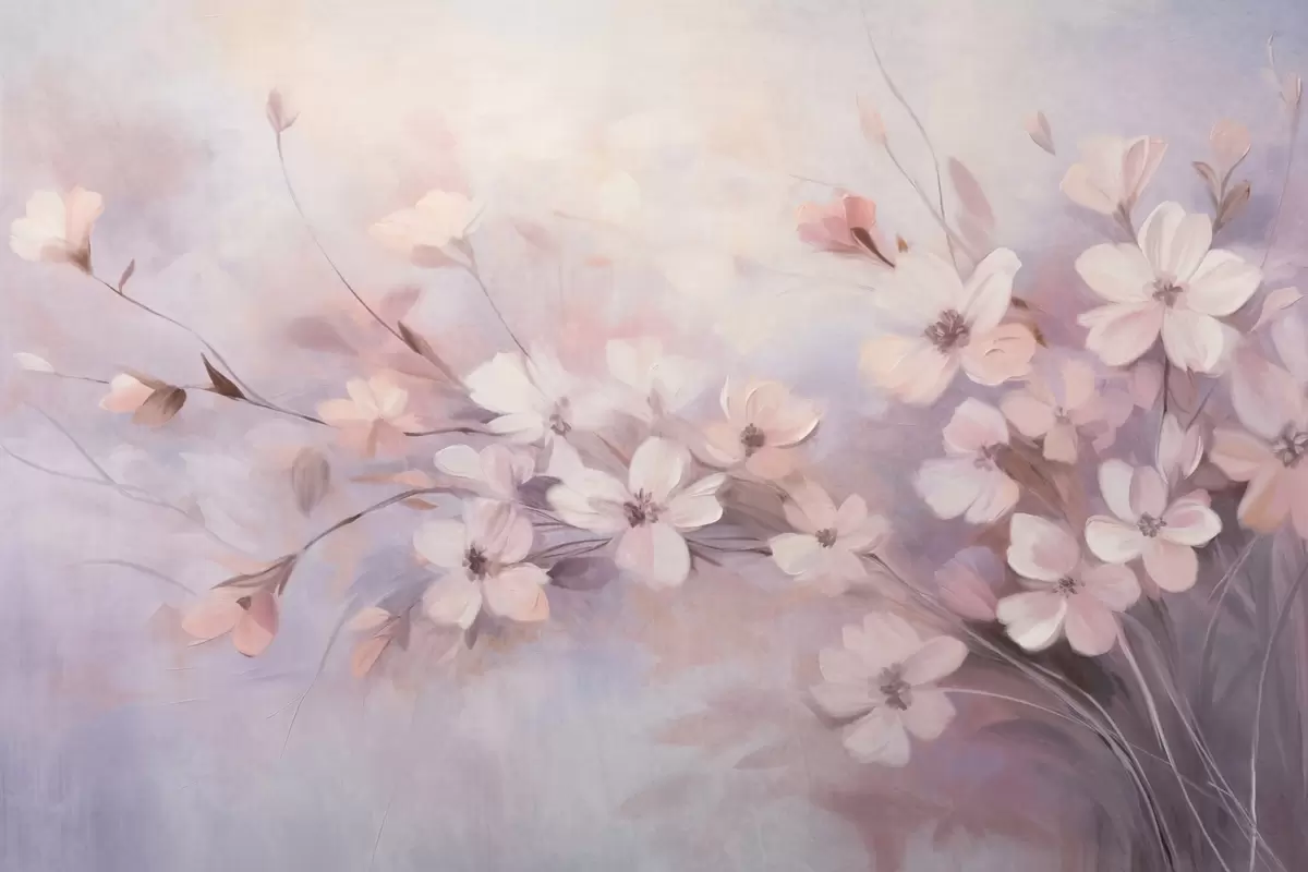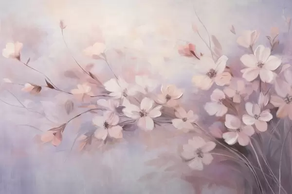 Фотошпалери Квіткова композиція з ніжними квітами з м'якими, розмитими краями, на пастельному тлі лавандових і світло-рожевих відтінків w09369