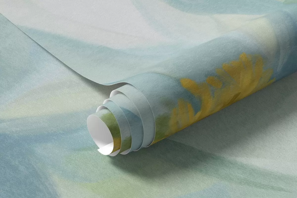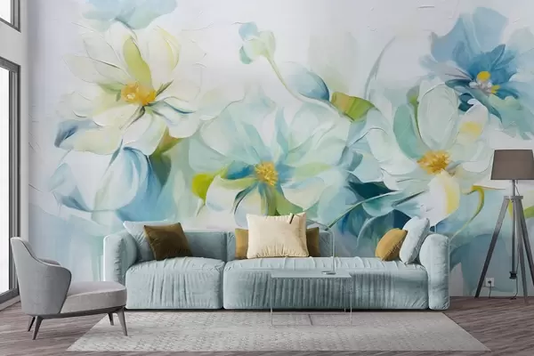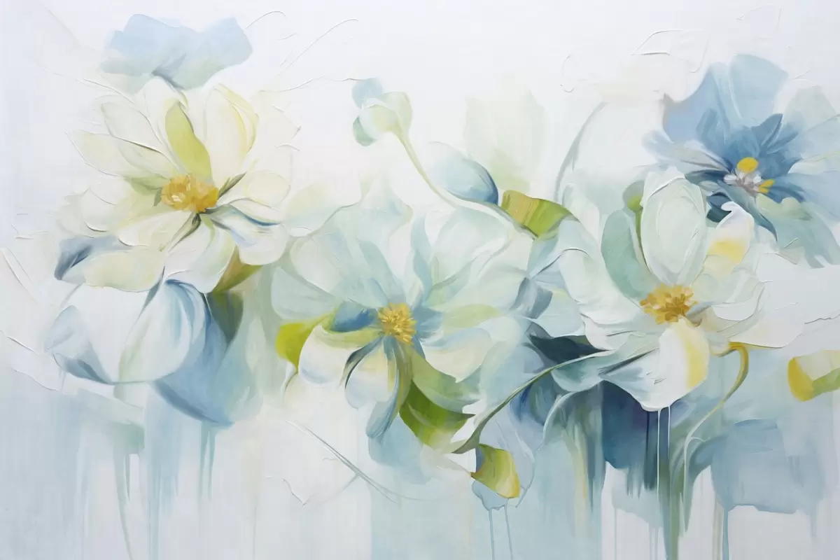 Фотошпалери Абстрактні біло-блакитні квіти з жовтими маточками та зеленим листям, на білому тлі, фактурний живопис w09372
