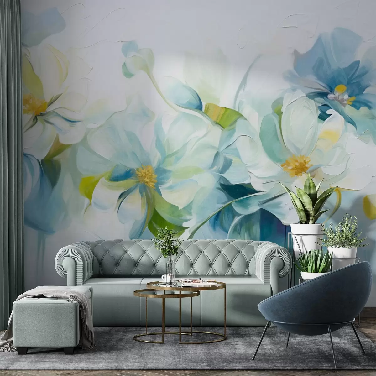 Фотошпалери Абстрактні біло-блакитні квіти з жовтими маточками та зеленим листям, на білому тлі, фактурний живопис w09372
