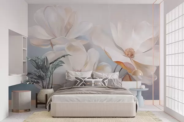 Фотошпалери Білі фантазійні квіти магнолії з ніжними текстурними пелюстками, м'який абстрактний фон w09373