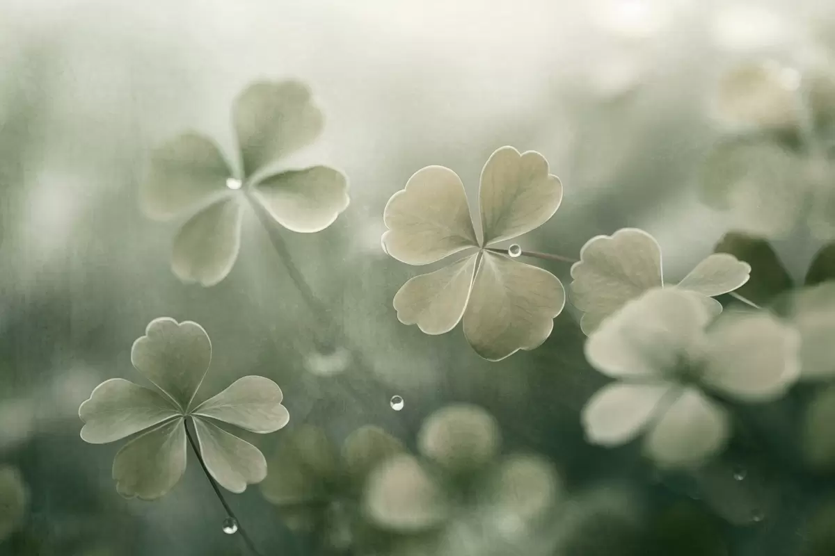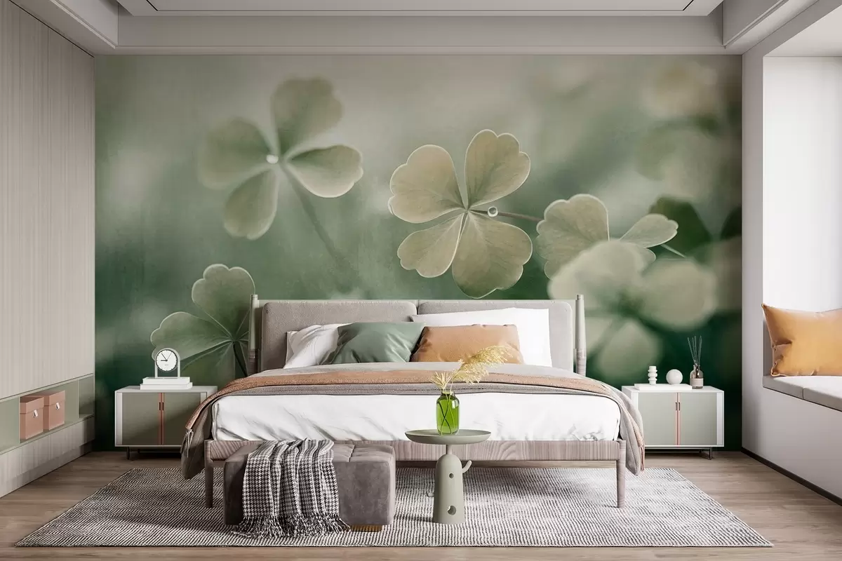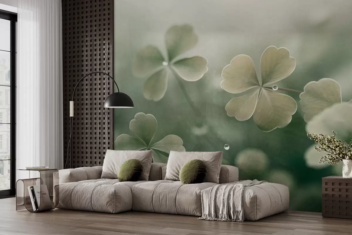 Фотошпалери Чотирилиста конюшина з краплями води, світло-зелений колір, м'який фокус, розмитий фон, фактурний друк w09376