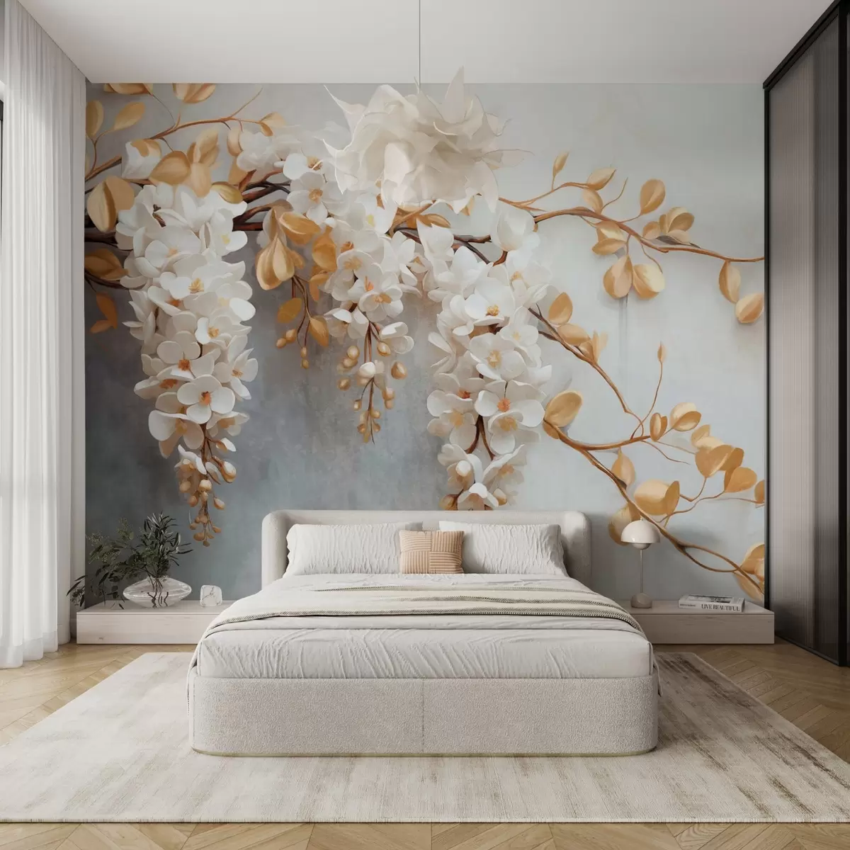 Фотошпалери Білі квіти гліцинії з жовтим листям на гілці, каскадом спадають на фактурному білому тлі, ніжні пелюстки w09381