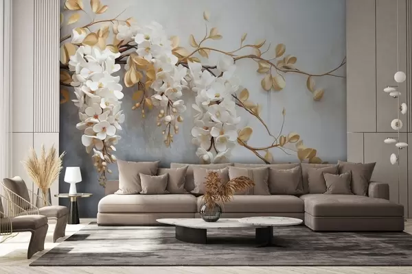 Фотошпалери Білі квіти гліцинії з жовтим листям на гілці, каскадом спадають на фактурному білому тлі, ніжні пелюстки w09381