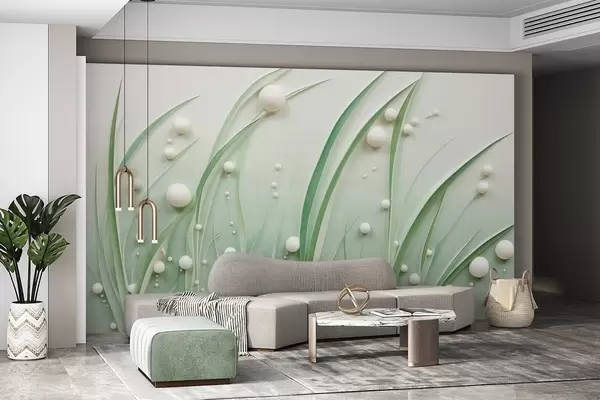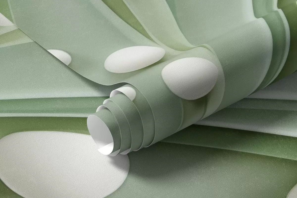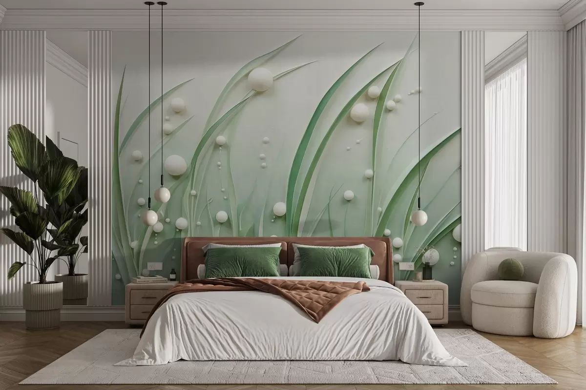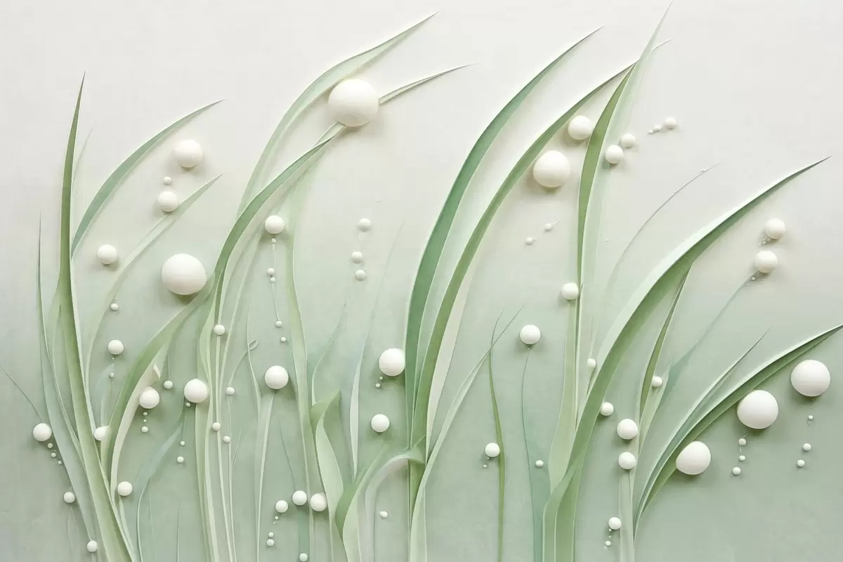 Фотошпалери Абстрактна зелена трава з білими кулями, світло-зелене тло, текстура, чіткі лінії, мінімалістичний стиль w09382