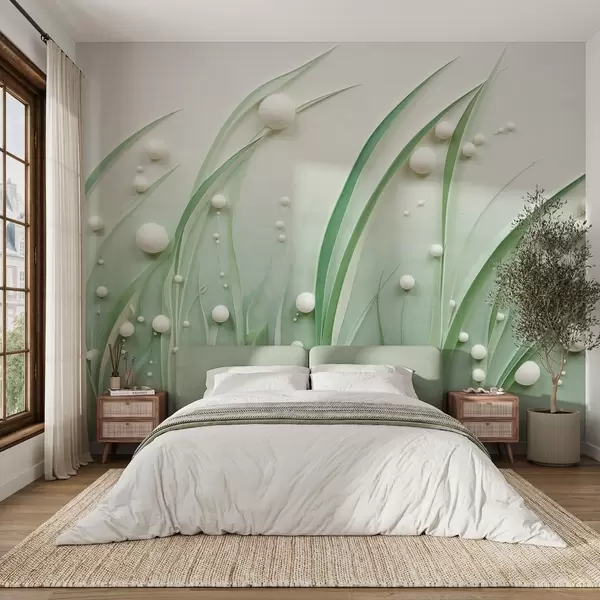 Фотошпалери Абстрактна зелена трава з білими кулями, світло-зелене тло, текстура, чіткі лінії, мінімалістичний стиль w09382