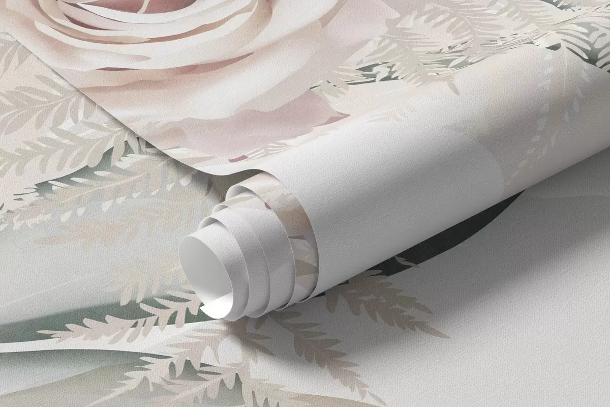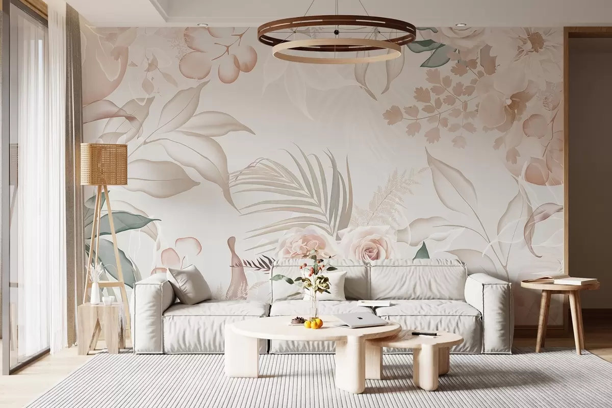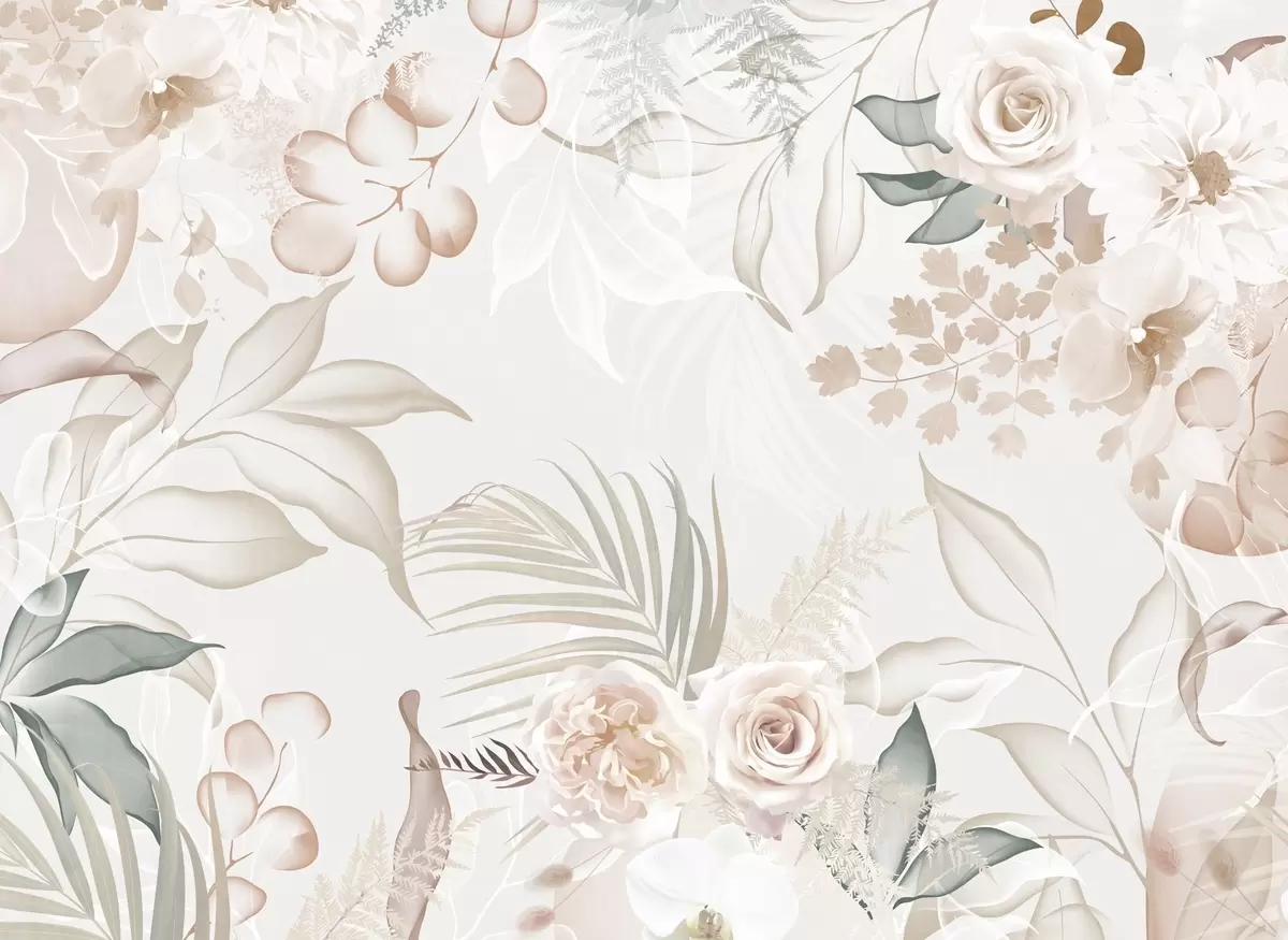 Фотошпалери Квіткова композиція з трояндами, орхідеями, евкаліптом і пальмовим листям в пастельних тонах, бежевий фон w09393