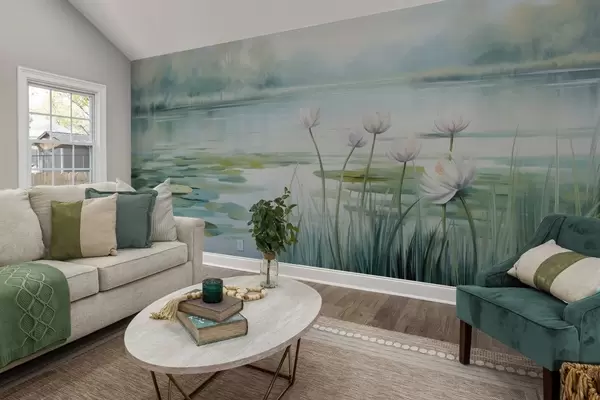 Фотошпалери Пейзаж з озером, водяними ліліями та лілієвими листками, деревами на задньому плані, в спокійному оточенні, світло-блакитні та зелені тони w09395