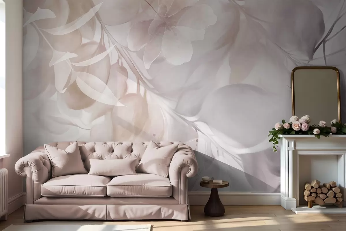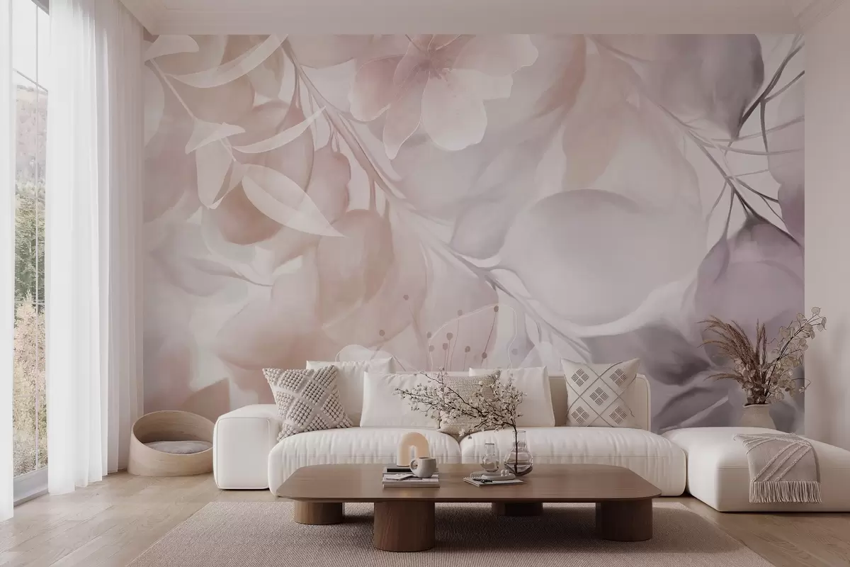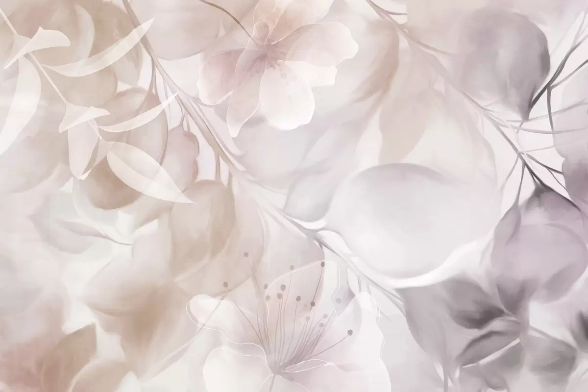 Фотошпалери Квіткове мистецтво з приглушеними бежевими та коричневими квітами, листям і гілками, м'якими пастельними кольорами, ефектом акварельної текстури w09397
