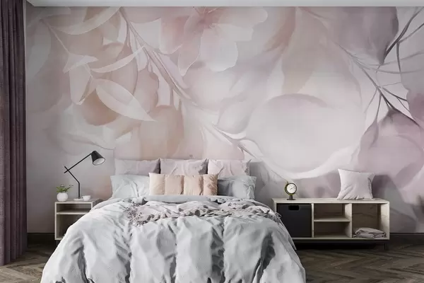 Фотошпалери Квіткове мистецтво з приглушеними бежевими та коричневими квітами, листям і гілками, м'якими пастельними кольорами, ефектом акварельної текстури w09397