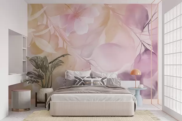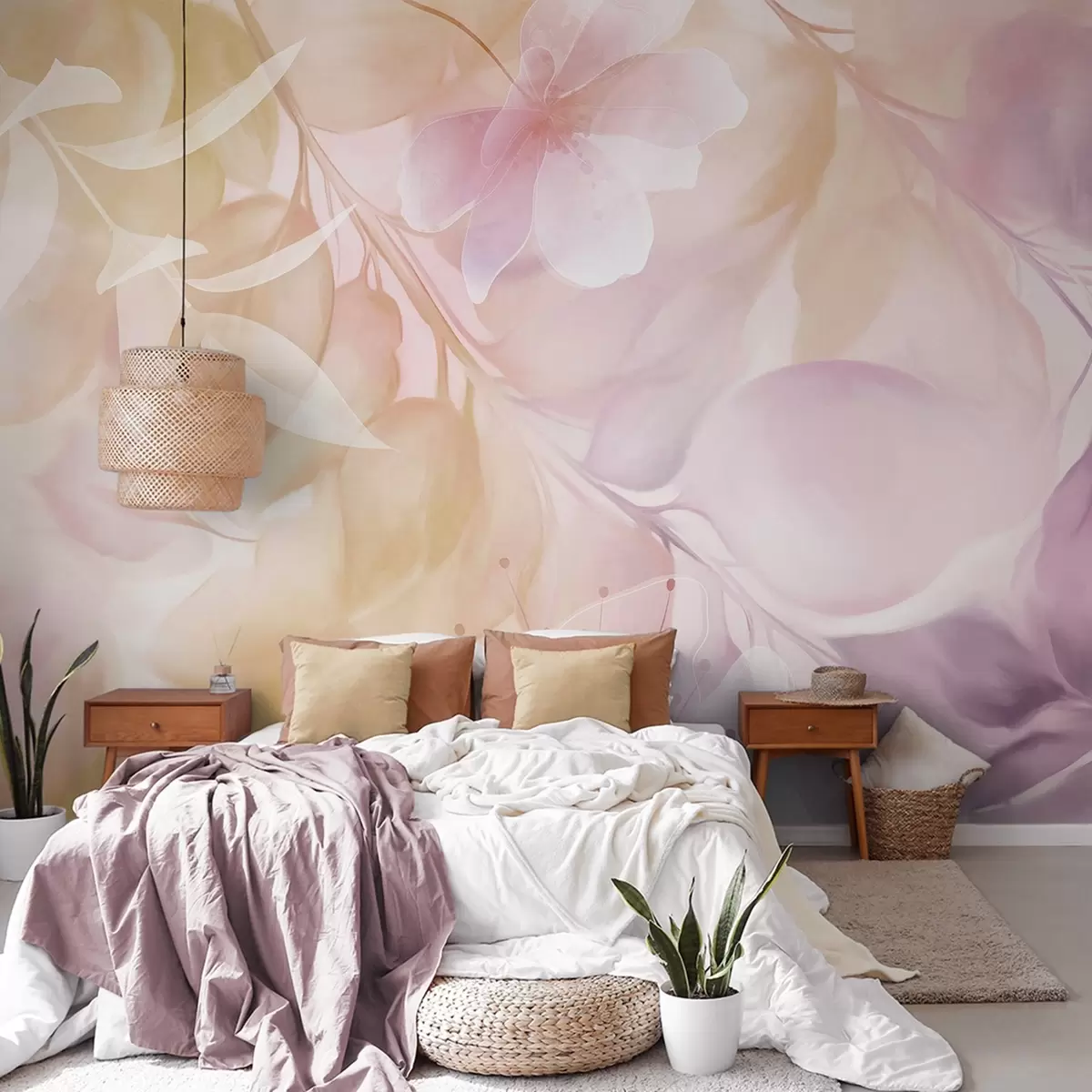 Фотошпалери Квіткове мистецтво з приглушеними жовтими та фіолетовими квітами, листям і гілками, м'якими пастельними кольорами, ефектом акварельної текстури w09397v2