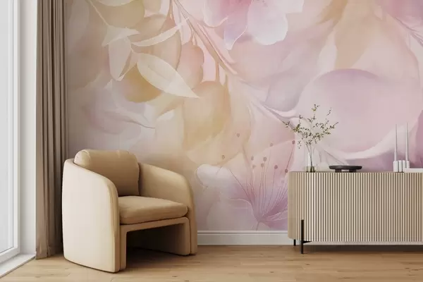 Фотошпалери Квіткове мистецтво з приглушеними жовтими та фіолетовими квітами, листям і гілками, м'якими пастельними кольорами, ефектом акварельної текстури w09397v2
