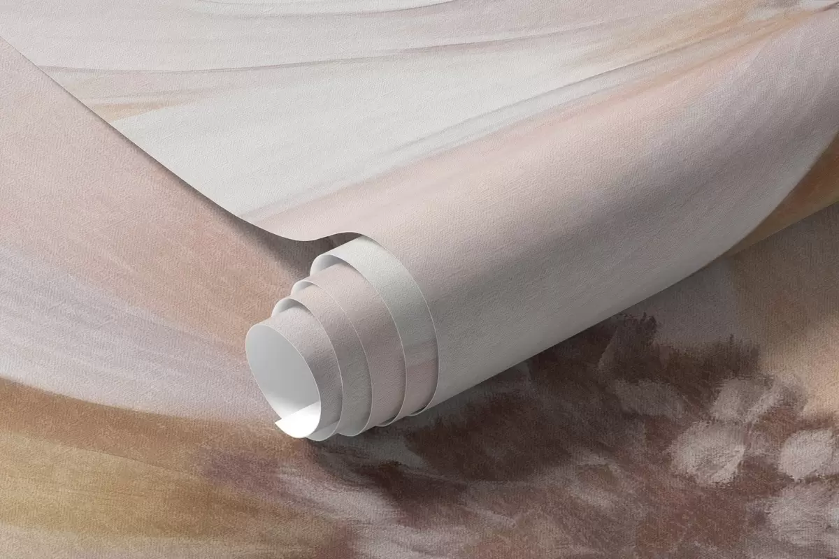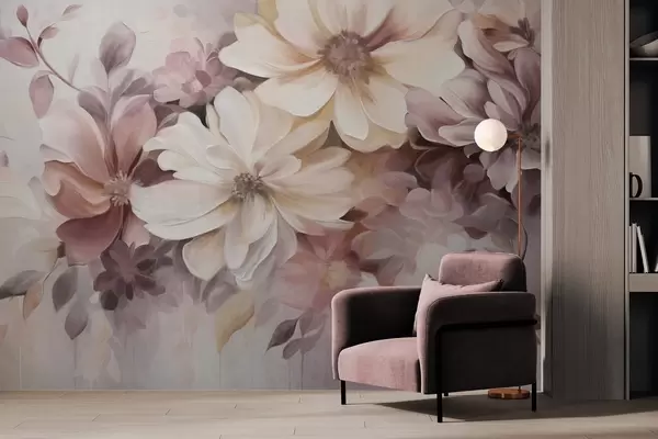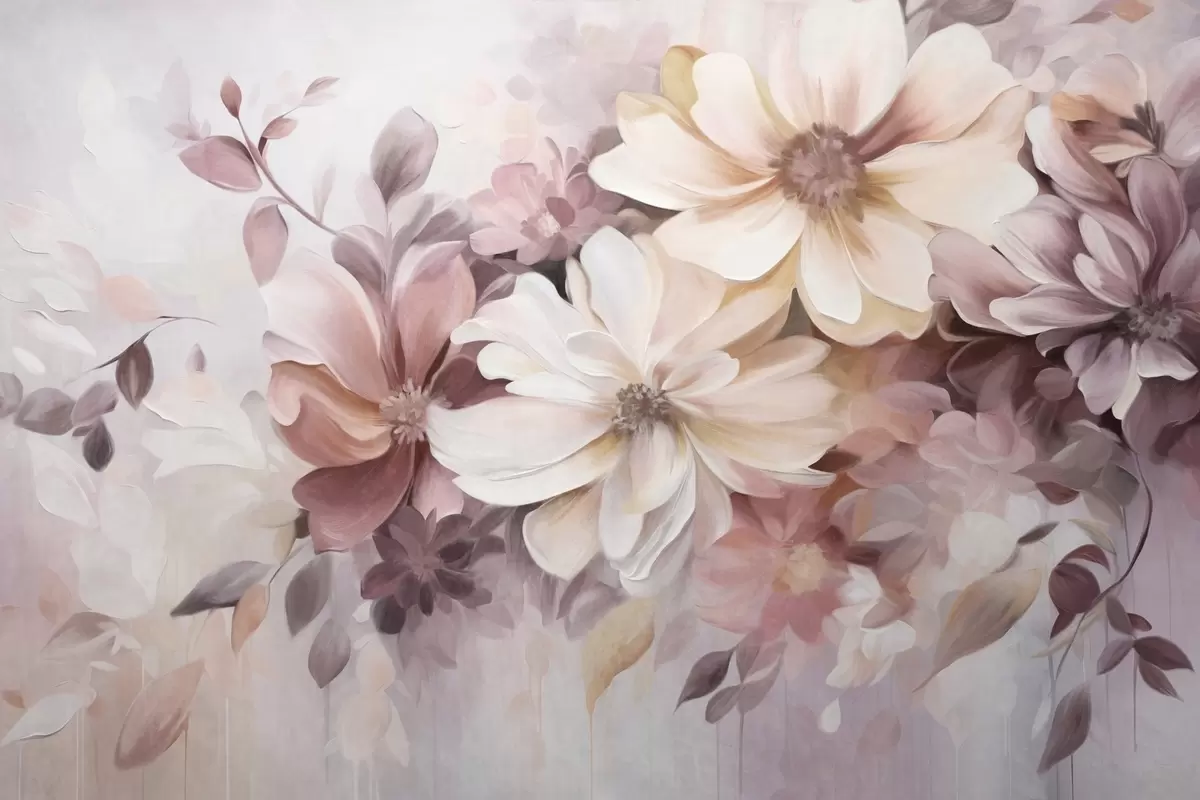 Фотошпалери Квіткова композиція з великими текстурними квітами м'яких кольорів у відтінках бордового, персикового та білого, з ніжним листям w09398