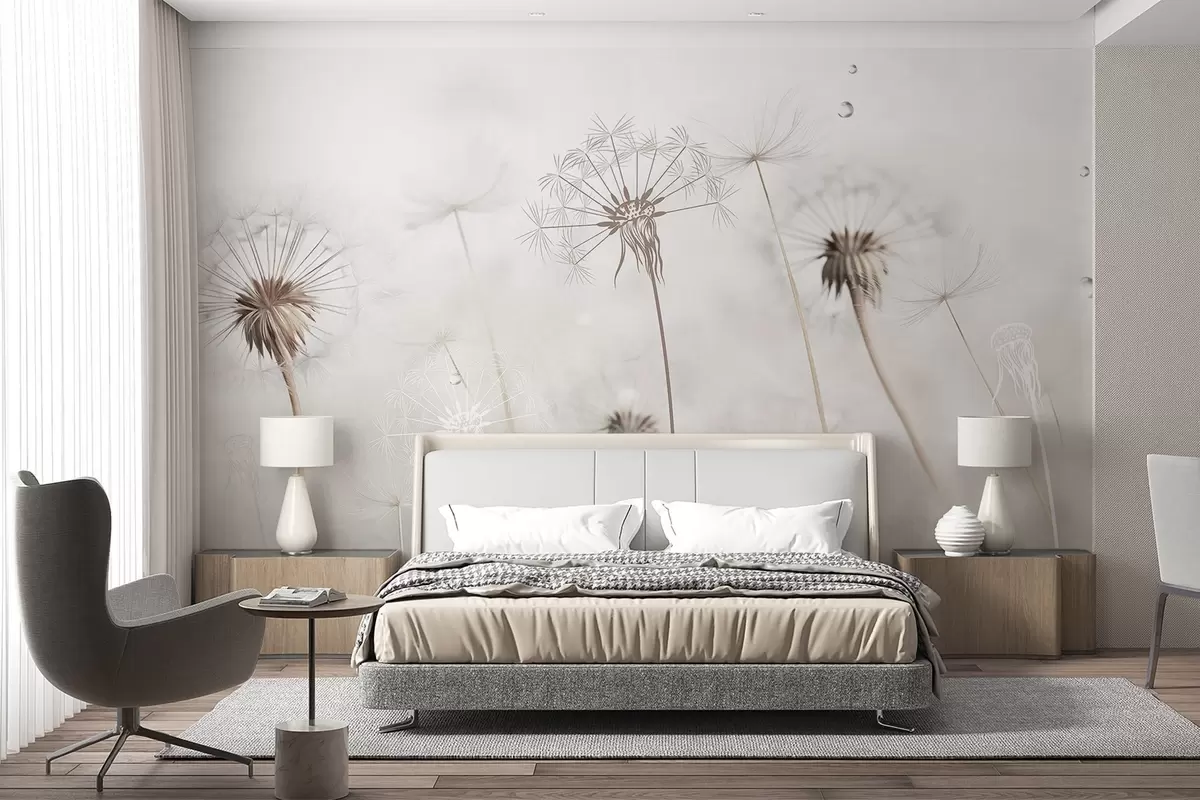 Фотошпалери Кульбаби з краплями води, білий фон, крупний план, м'яке світло, природа, ботаніка, ефірність, витонченість, мінімалізм w09399