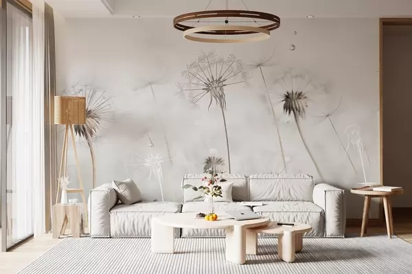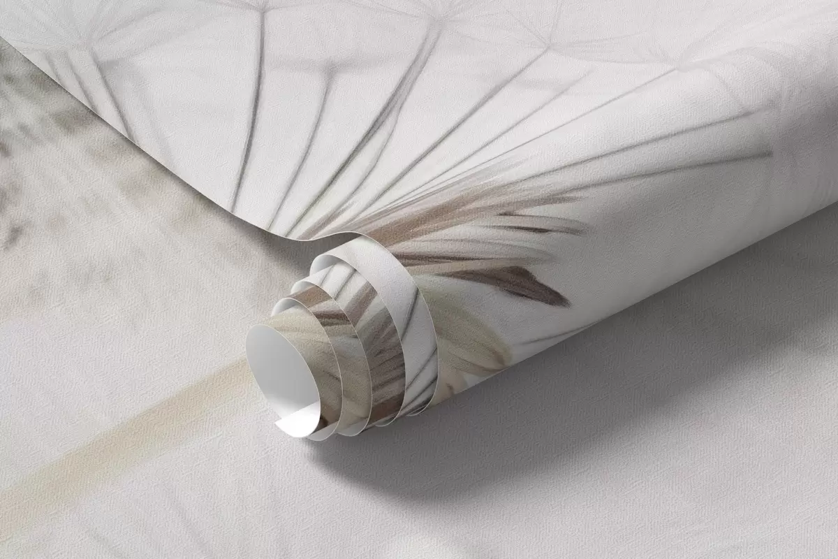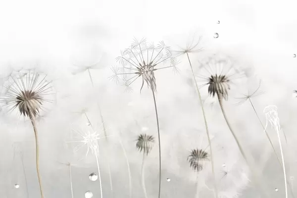 Фотошпалери Кульбаби з краплями води, білий фон, крупний план, м'яке світло, природа, ботаніка, ефірність, витонченість, мінімалізм w09399