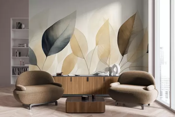Фотошпалери Текстуроване малювання імітації листя в відтінках коричневого, жовтого та сірого кольорів, з ніжними прожилками та стеблами w09400