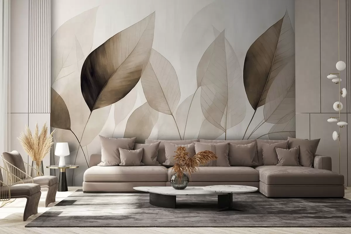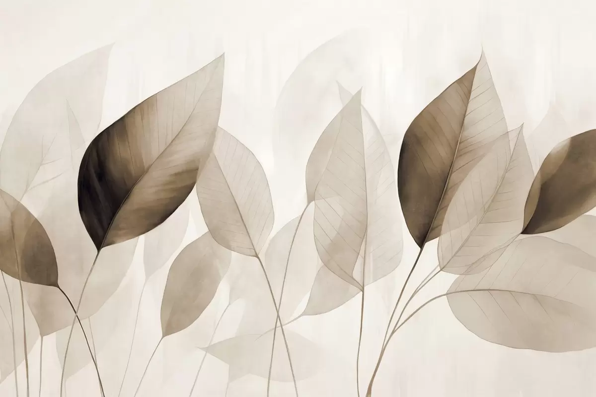 Фотошпалери Текстуроване фарбування, що імітує листя в відтінках коричневого та бежевого кольорів з ніжними прожилками та стеблами w09400v1