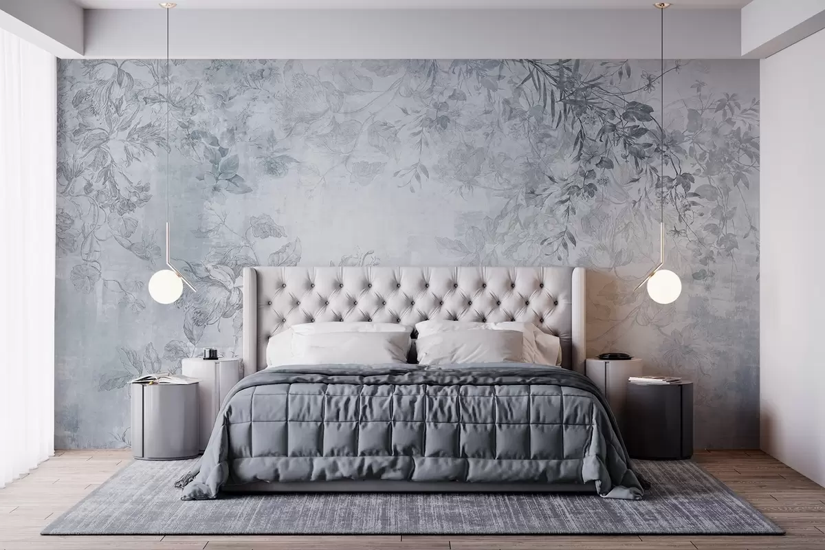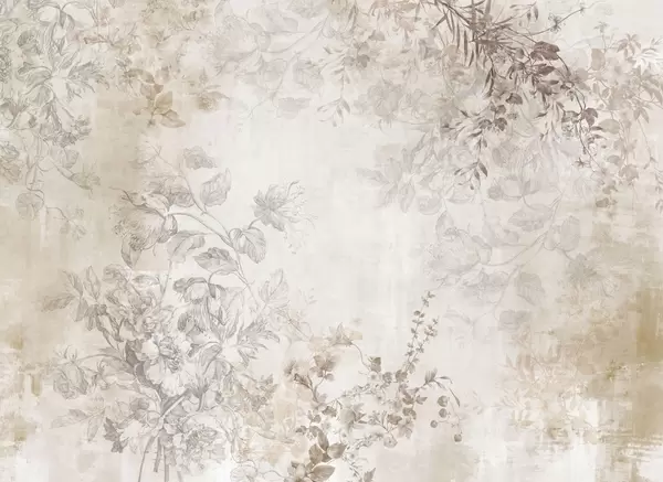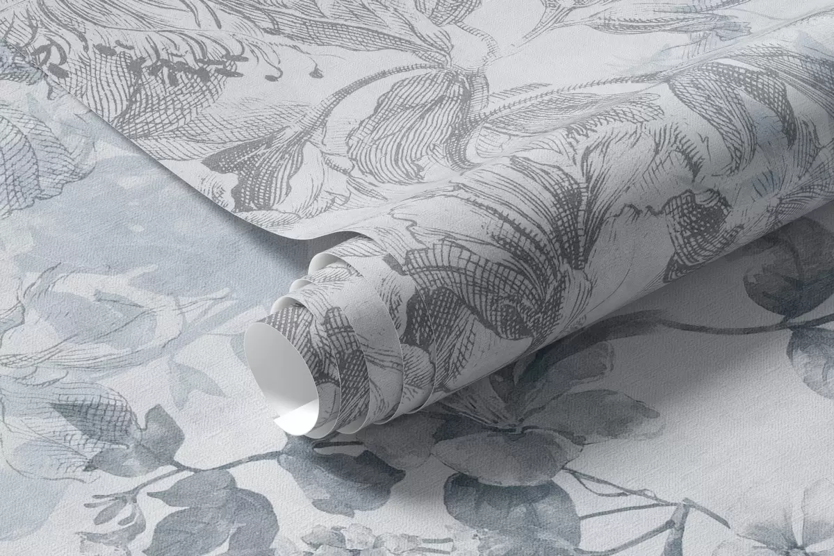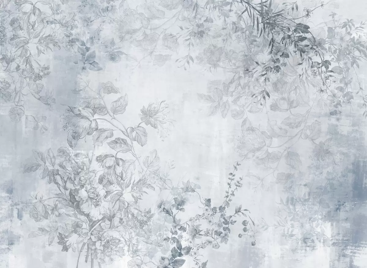 Фотошпалери Вінтажне текстуроване квіткове мистецтво з ілюстраціями ніжних садових квітів і листя в стилі малюнка, м'які блакитні тони w09402v1