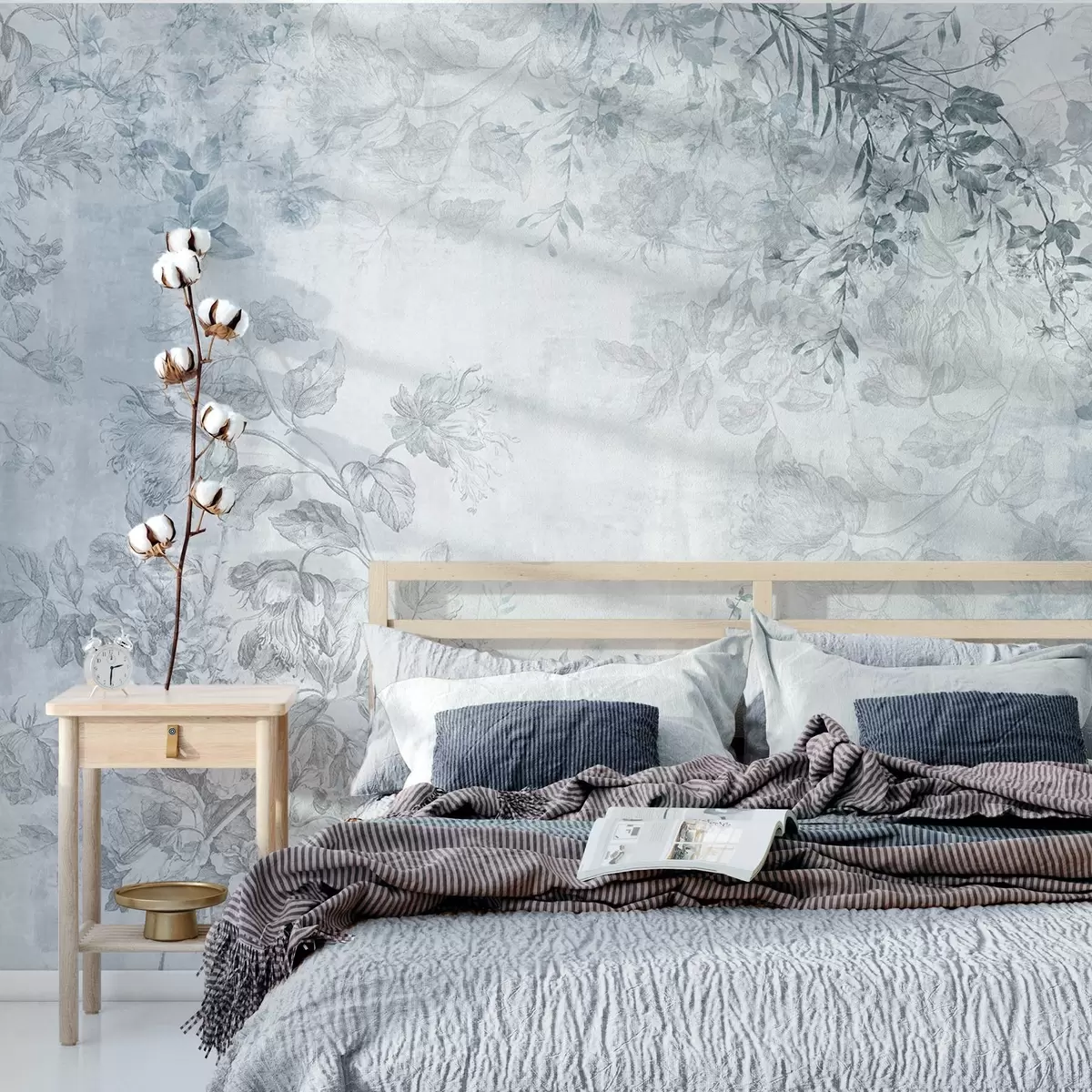 Фотошпалери Вінтажне текстуроване квіткове мистецтво з ілюстраціями ніжних садових квітів і листя в стилі малюнка, м'які блакитні тони w09402v1