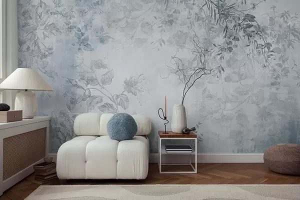 Фотошпалери Вінтажне текстуроване квіткове мистецтво з ілюстраціями ніжних садових квітів і листя в стилі малюнка, м'які блакитні тони w09402v1