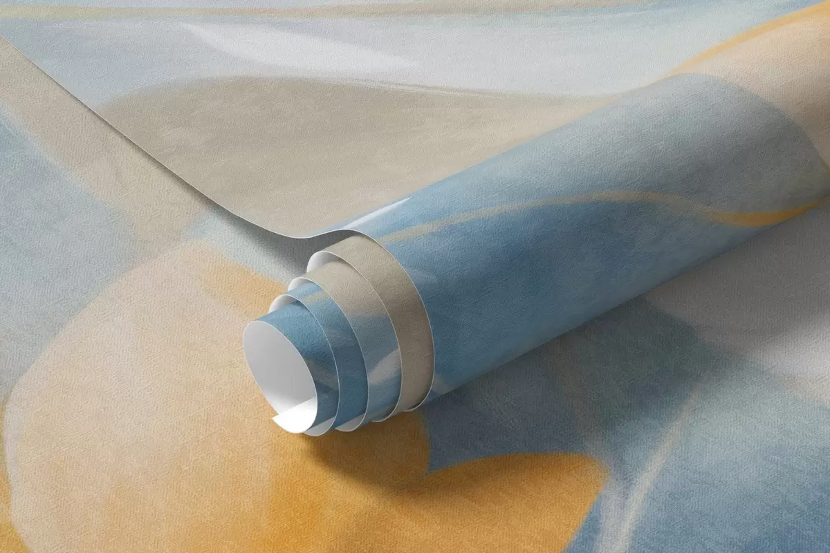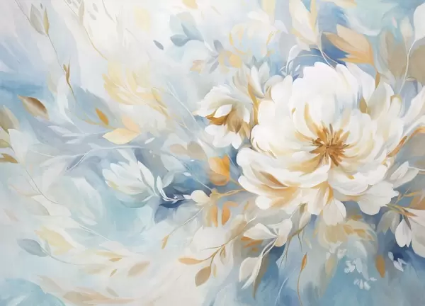 Фотошпалери Текстурована біла квітка з синіми та жовтими деталями і листям на синьо-білому абстрактному тлі, стиль живопису w09403
