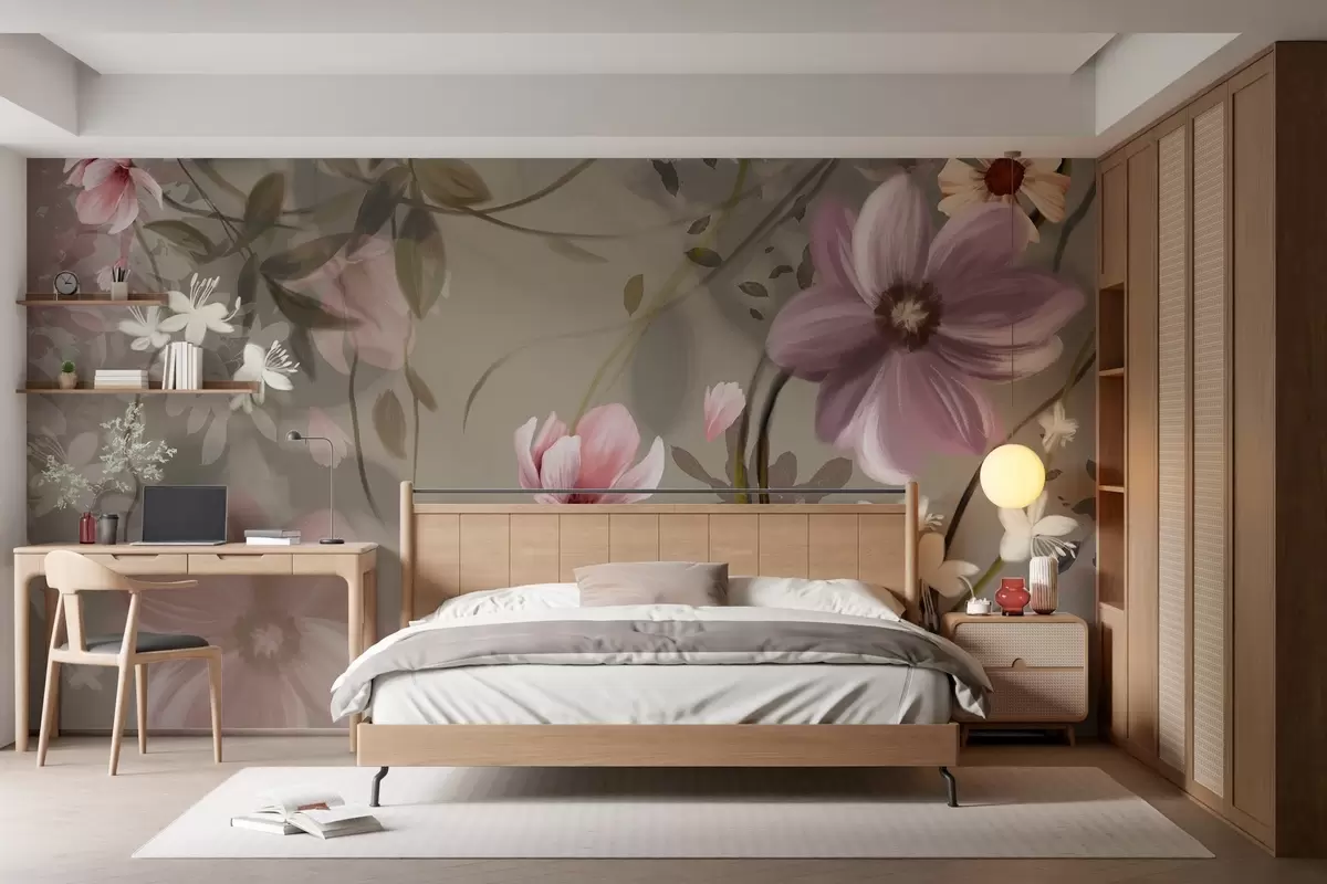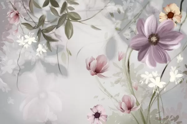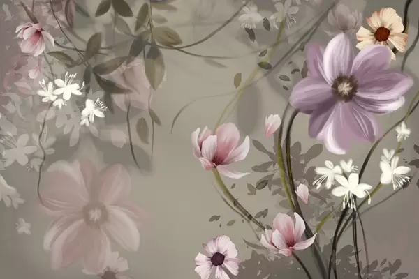 Фотошпалери Рожеві та білі квіти з коричневими стеблами та листям, м'яке освітлення, приглушені кольори, квіткова композиція w09417