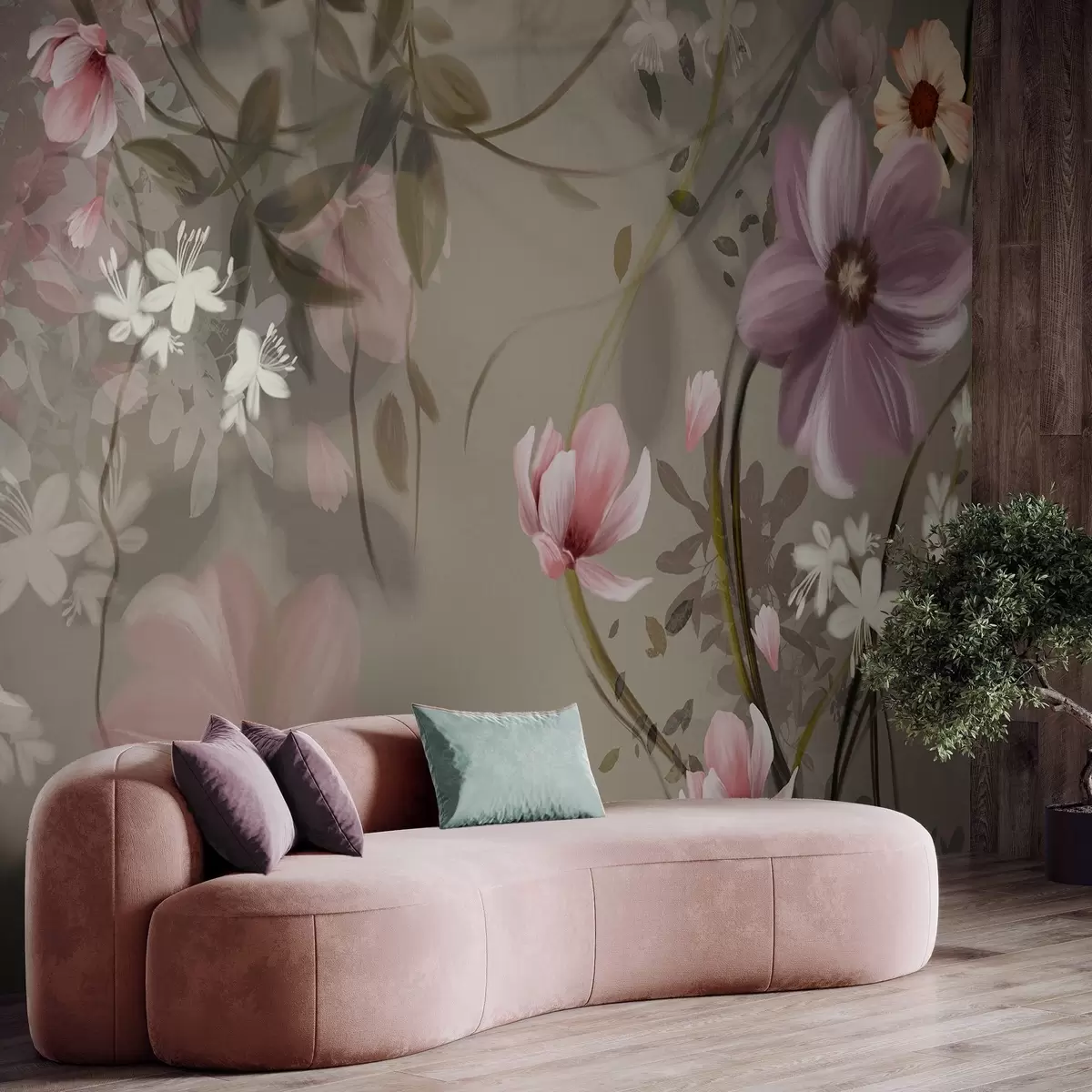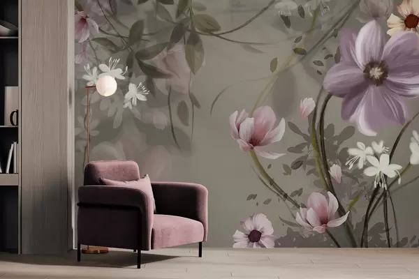 Фотошпалери Рожеві та білі квіти з коричневими стеблами та листям, м'яке освітлення, приглушені кольори, квіткова композиція w09417