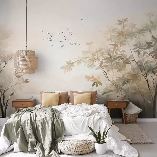 Фотошпалери Текстурований пейзаж з деревами і зграєю птахів, що летять у небі, пастельні кольори, природна сцена w09418