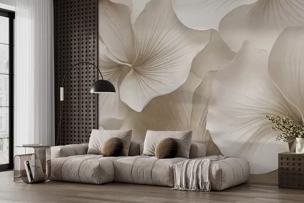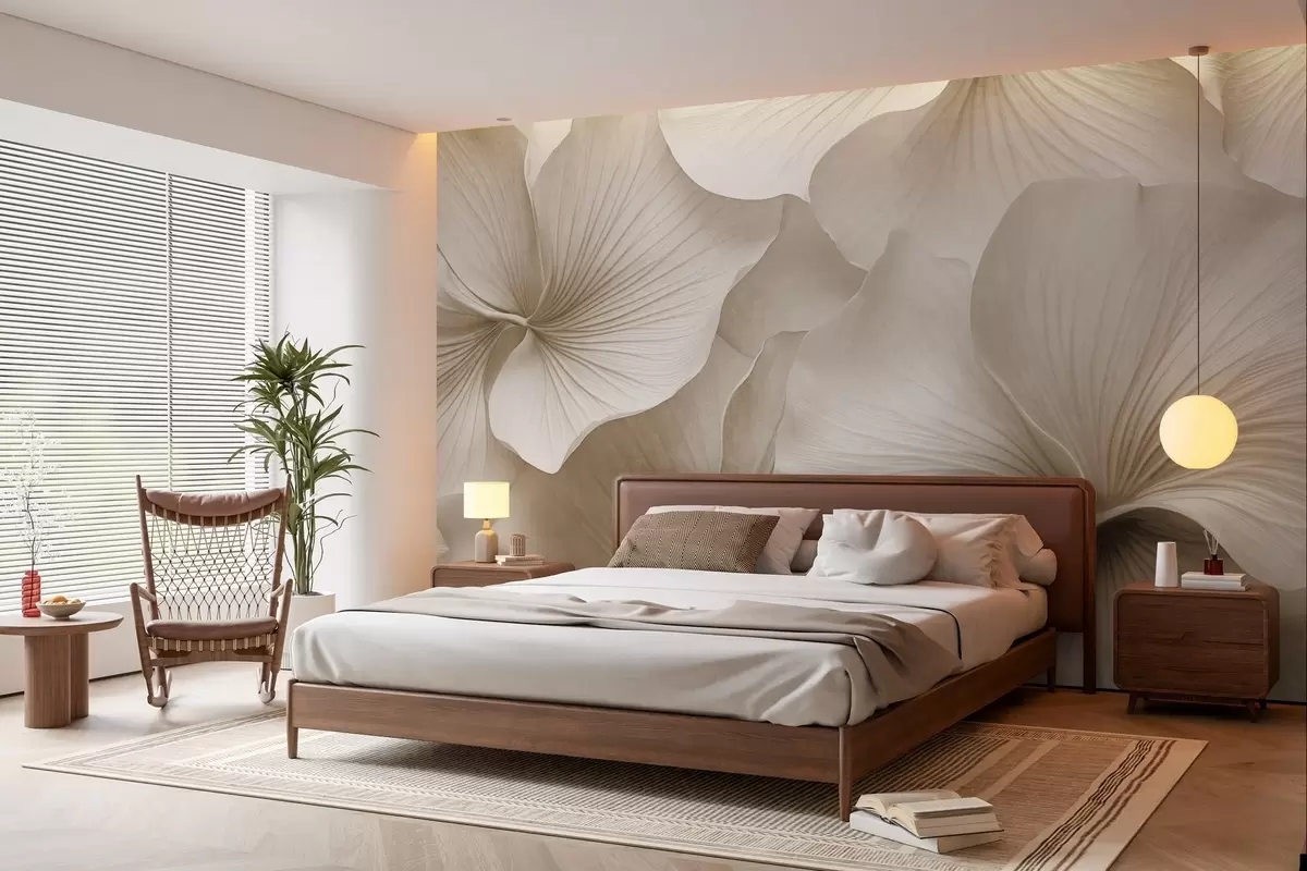 Фотошпалери Біло-бежеві листя гінкго, м'яка текстура, абстрактний квітковий фон, мінімалістичний сучасний стиль w09421v1