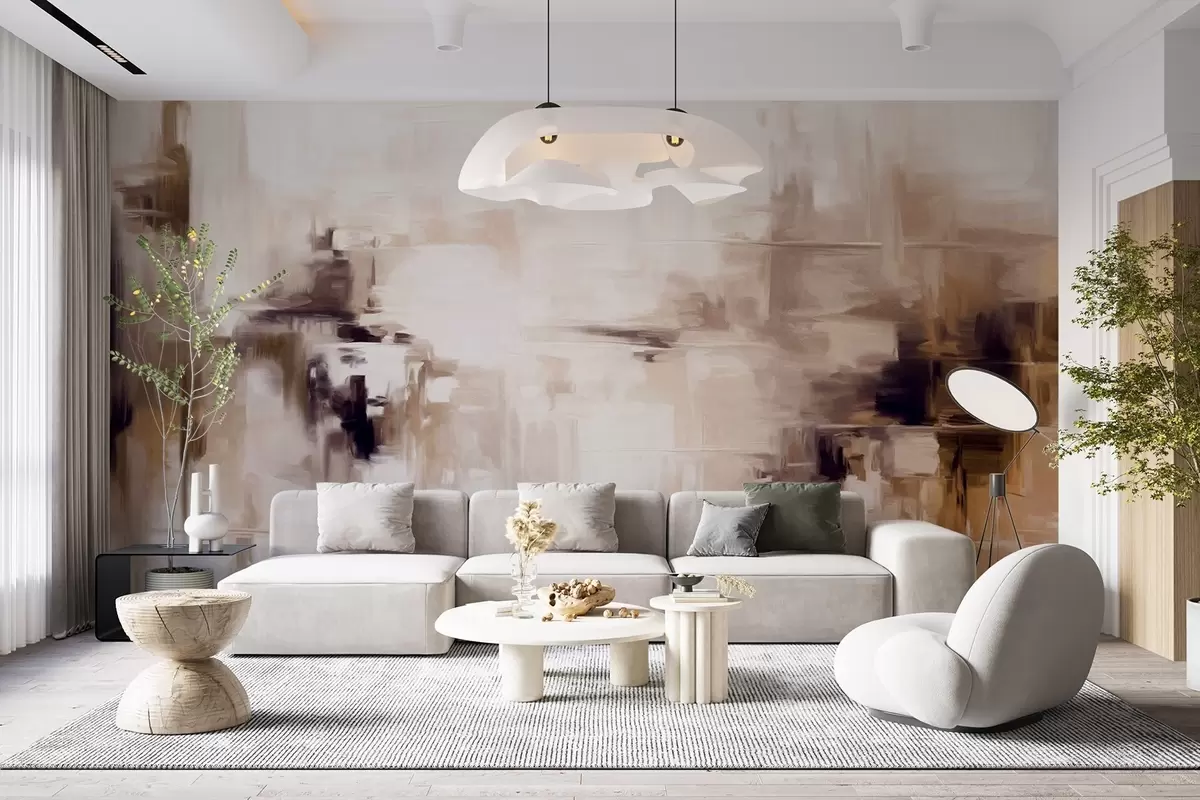 Фотошпалери Абстрактна текстурована імітація пейзажного живопису з коричневими та білими мазками, сучасний стиль w09422v1