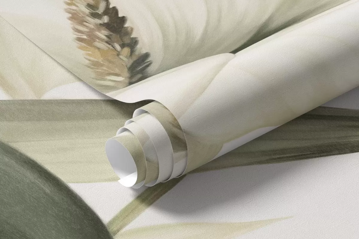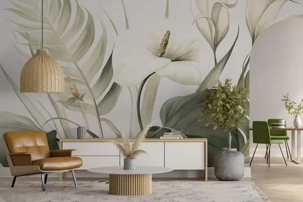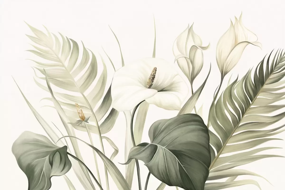 Фотошпалери Білі кали та зелене тропічне листя, ботанічна ілюстрація, світлий фон, вінтажний стиль, текстурований w09423