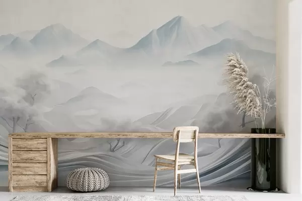 Шпалери Сніжний абстрактний декоративний гірський пейзаж з білими деревами та туманом, мінімалістичний текстурований стиль w09426