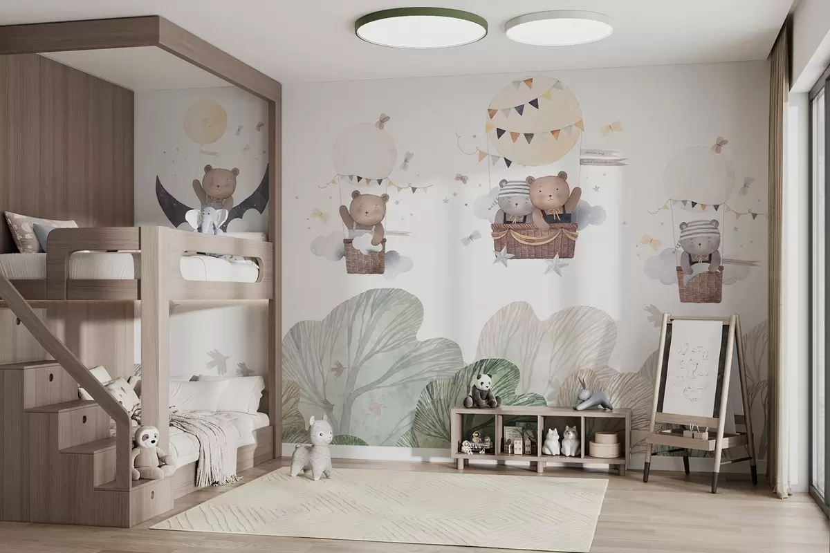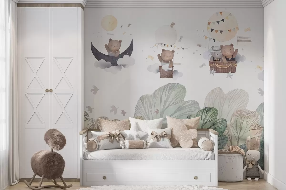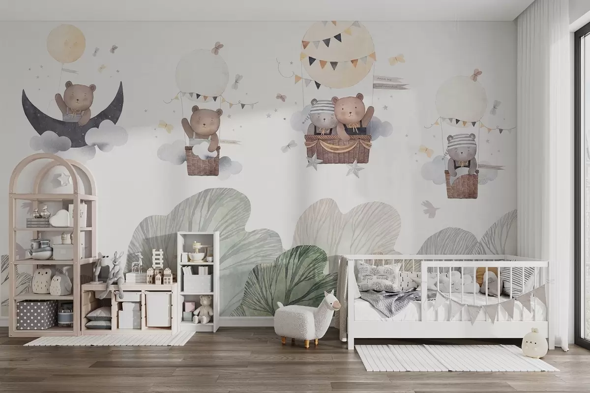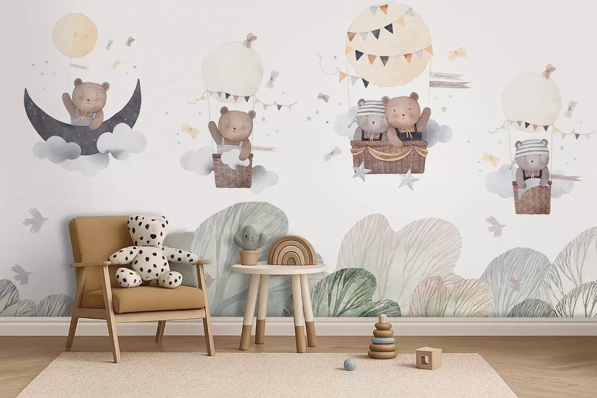 Фотошпалери Акварельні повітряні кулі з ведмедями над лісом w09437