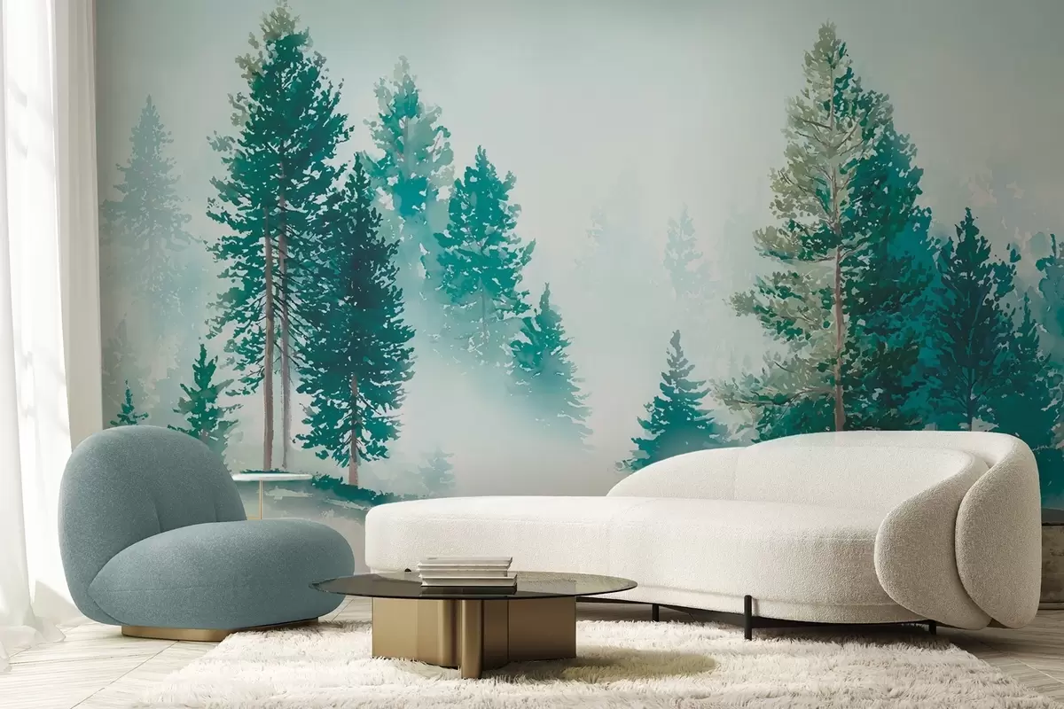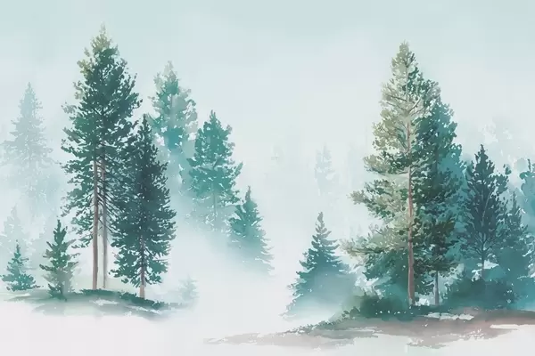 Фотошпалери Туманний сосновий ліс у стилі акварелі w09444