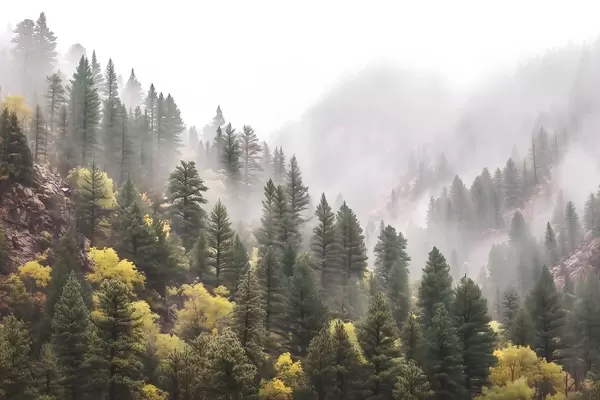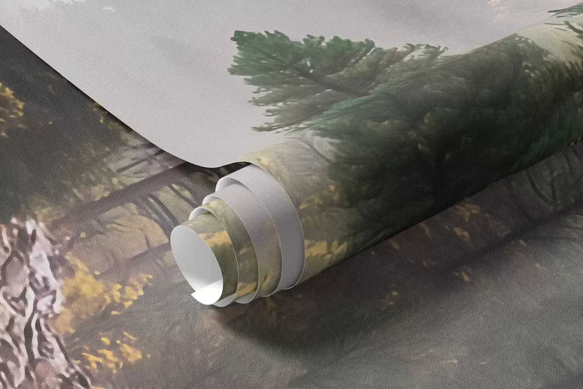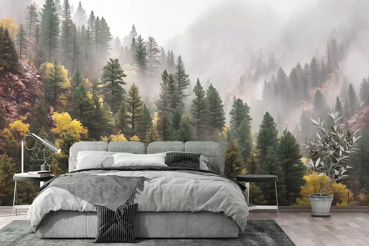 Фотошпалери Атмосферний туманний сосновий ліс в горах w09463
