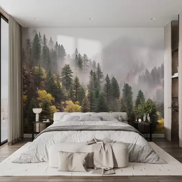 Фотошпалери Атмосферний туманний сосновий ліс в горах w09463