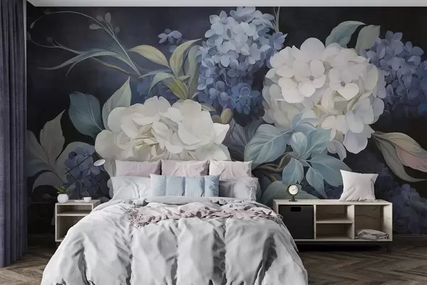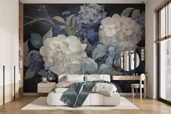 Фотошпалери Текстурована темно-синя картина, що імітує квіти гортензії з великим листям, абстрактний і темний фон w09465v1