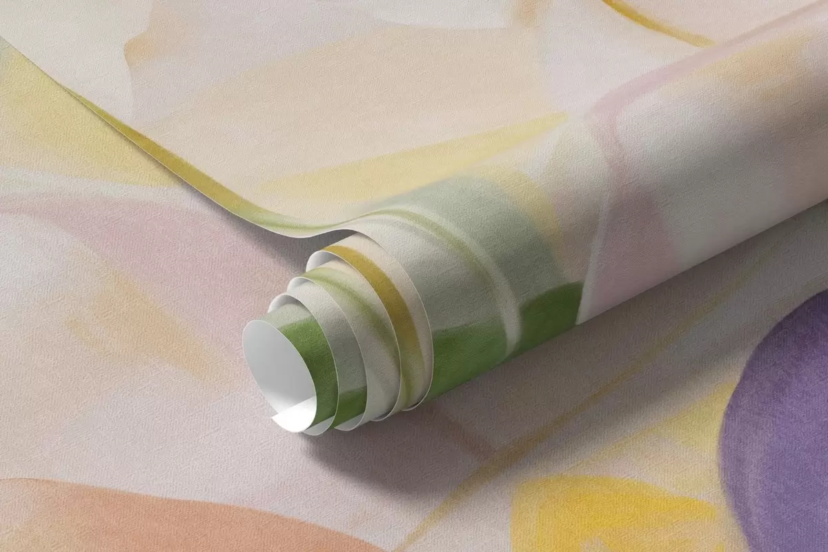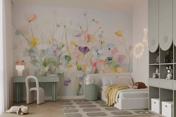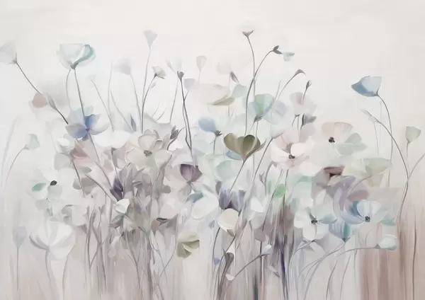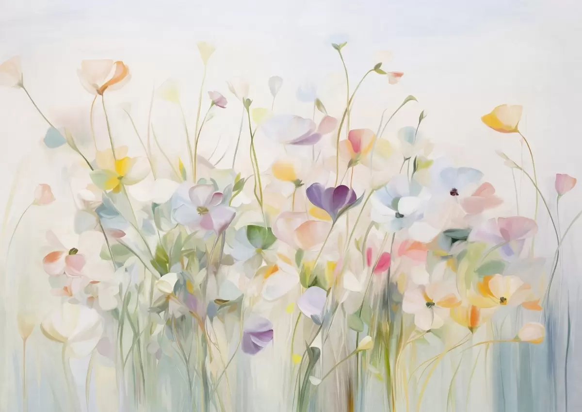 Фотошпалери Абстрактне поле з барвистими квітами з довгими стеблами та зеленим листям, текстуроване, пастельні, світлі кольори w09466