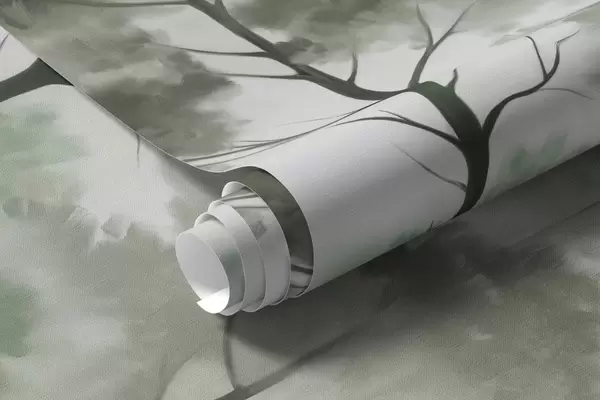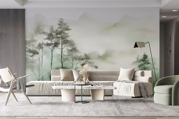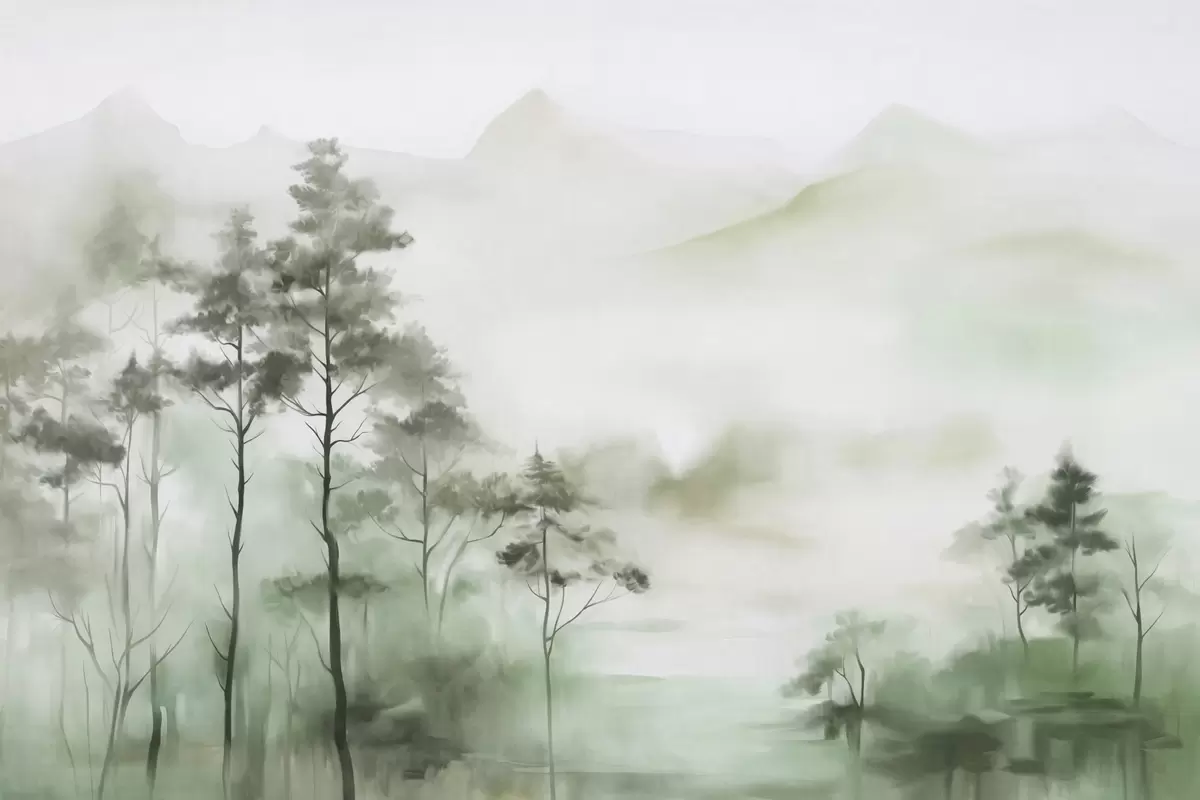 Фотошпалери Туманний пейзаж з високими деревами та горами в приглушених зелених і сірих тонах, мінімалістичний стиль, текстурований w09469
