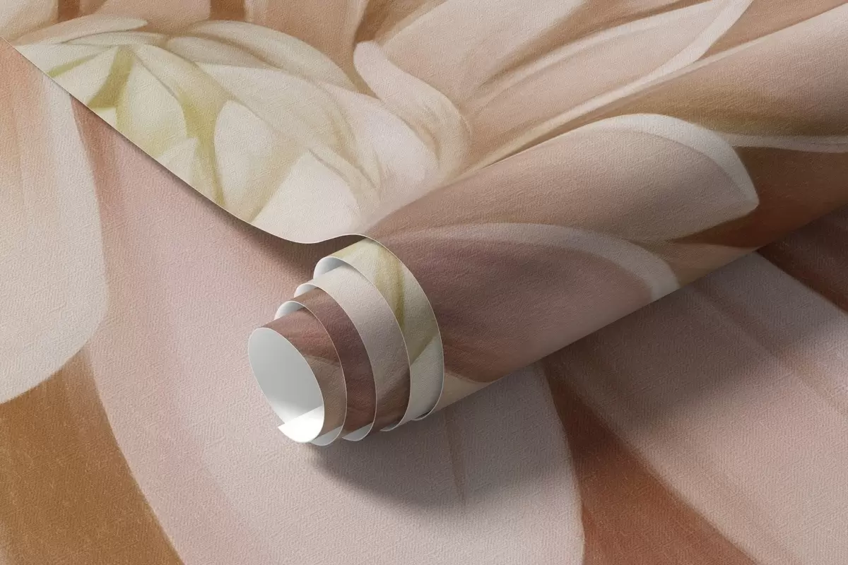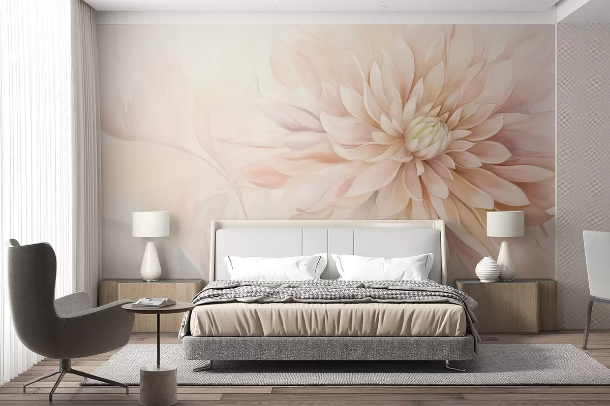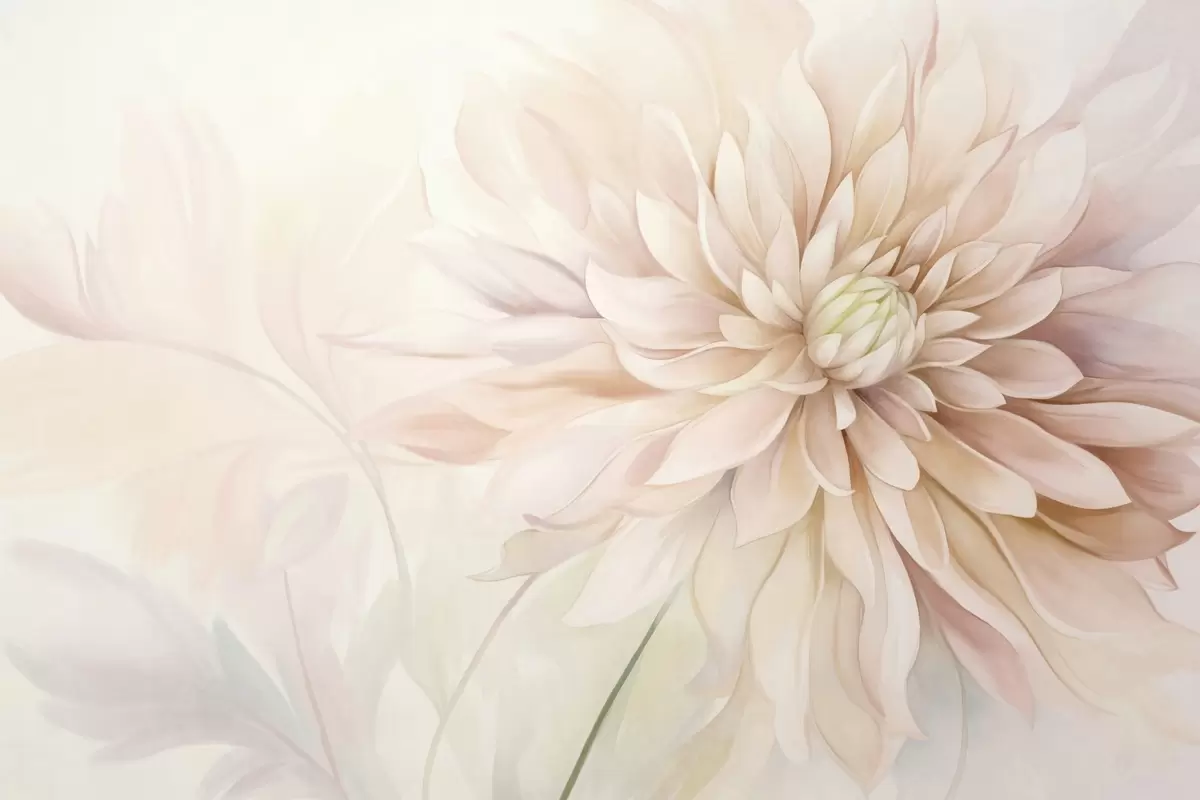 Фотошпалери Світло-рожева квітка жоржини з безліччю пелюсток, м'який пастельний фон з відтінками зеленого та бежевого кольорів w09470