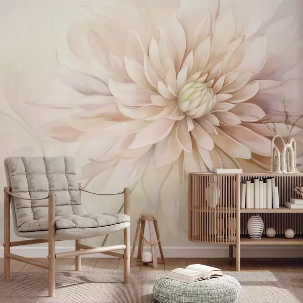 Фотошпалери Світло-рожева квітка жоржини з безліччю пелюсток, м'який пастельний фон з відтінками зеленого та бежевого кольорів w09470