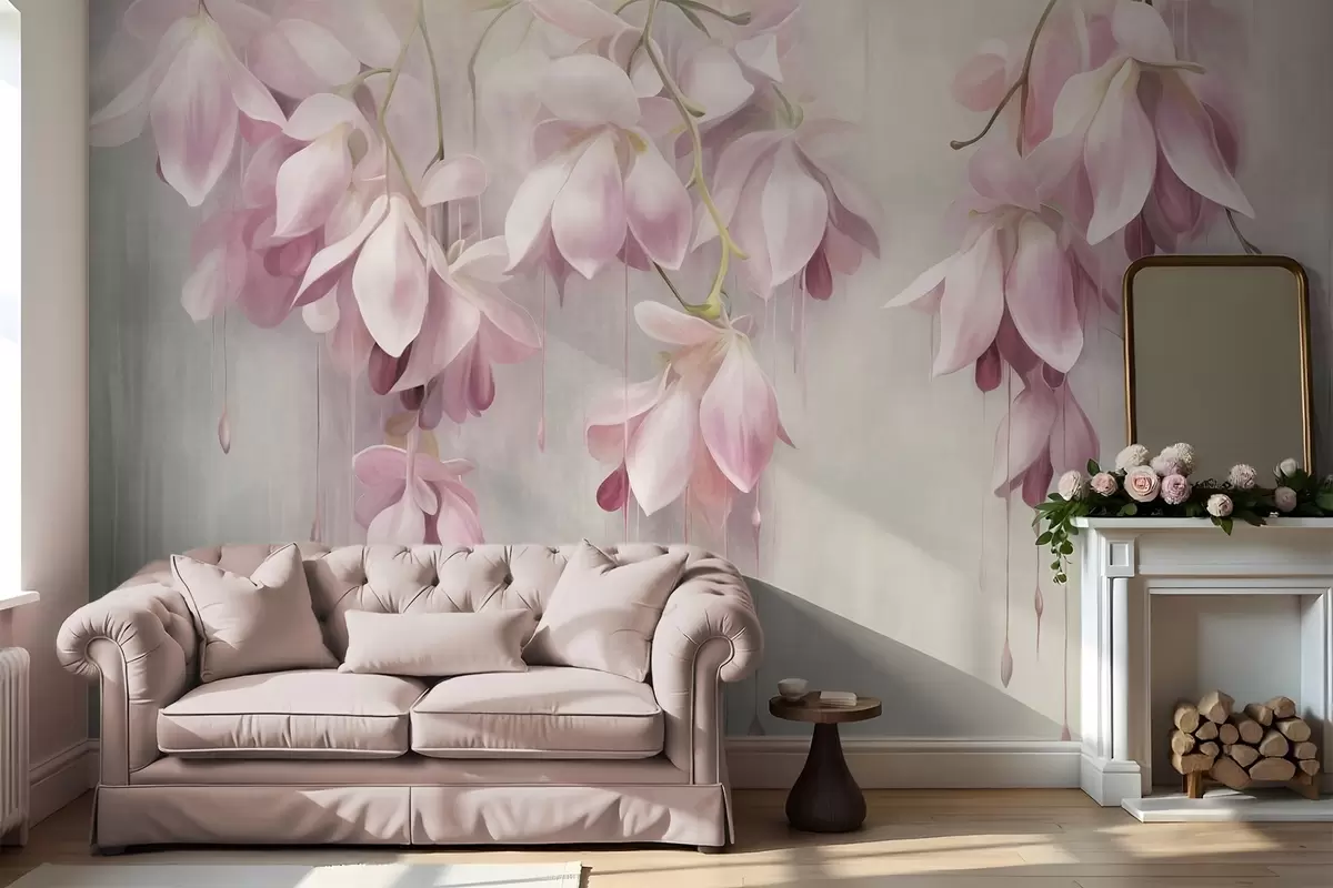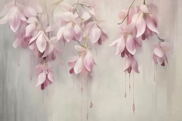 Фотошпалери Висячі рожеві квіти, світло-сірий фон, квіткова текстурована композиція, ботанічне мистецтво, пастельні кольори w09471
