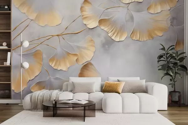 Фотошпалери Листя гінкго білоба з жовтими краями на гілці, сірий фактурний фон, елегантний і мінімалістичний дизайн w09472