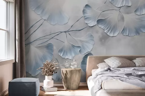 Фотошпалери Листя гінкго білоба з синіми краями на гілці, сірий фактурний фон, елегантний і мінімалістичний дизайн w09472v1