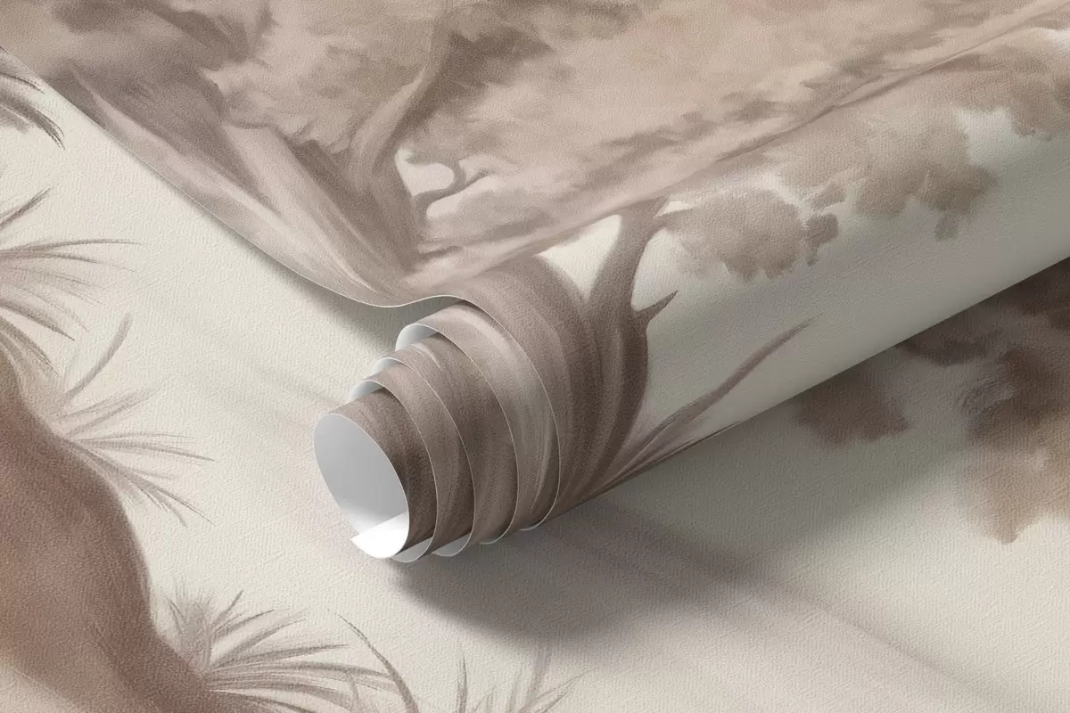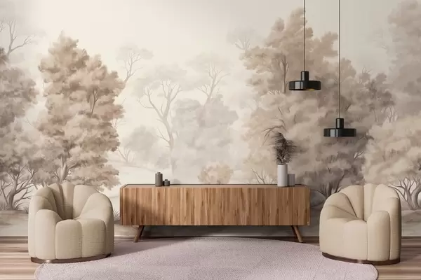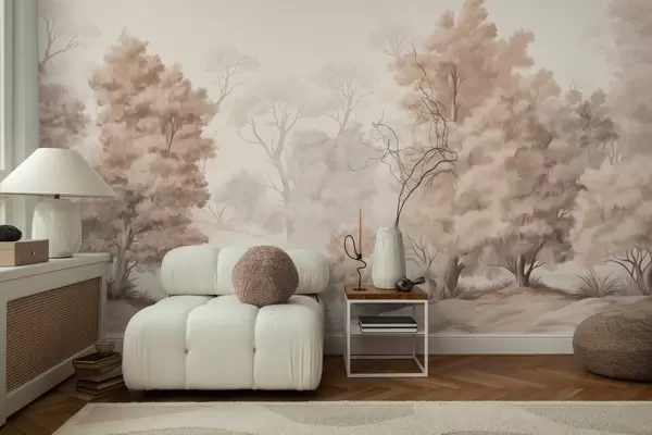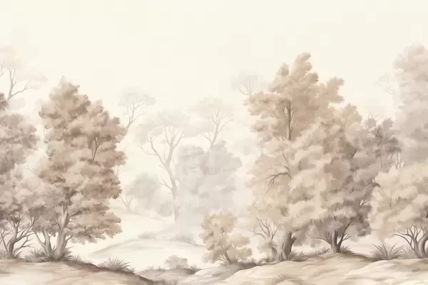 Фотошпалери Текстурована пейзажна картина, що імітує ліс з високими деревами та травою, приглушені та м'які кольори, заспокійлива сцена w09474