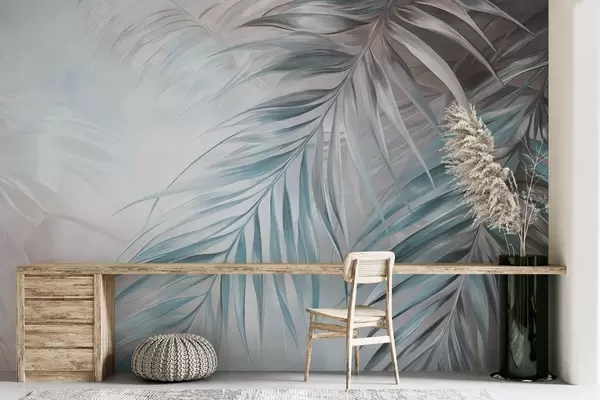 Фотошпалери Пальмове листя з сірими та синіми відтінками, світлий текстурований фон з м'якими кольорами, елегантний тропічний стиль w09475v1