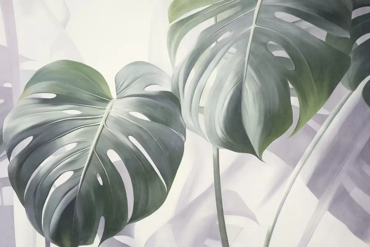 Фотошпалери Текстуровані листя монстери великі та зелені, на м'якому, світлому абстрактному тлі w09477