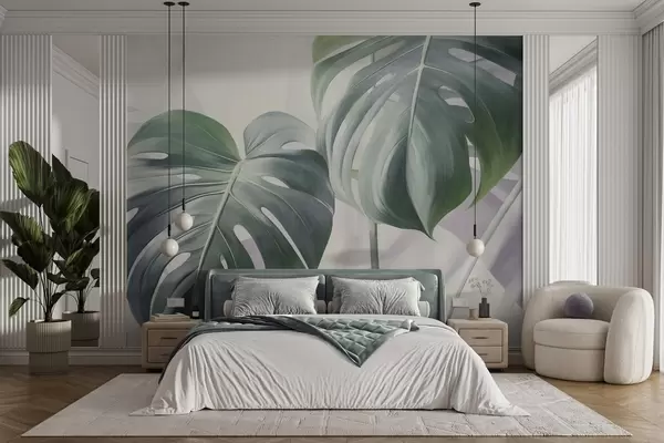 Фотошпалери Текстуровані листя монстери великі та зелені, на м'якому, світлому абстрактному тлі w09477
