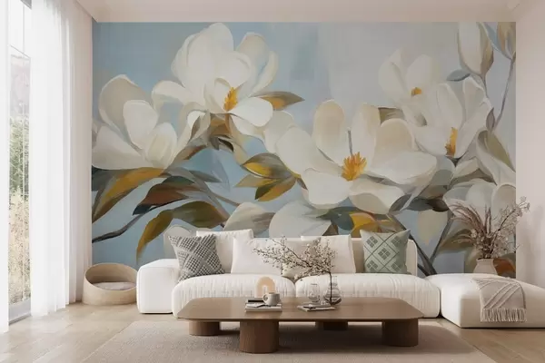 Фотошпалери Білі магнолії з зеленим листям на світло-блакитному тлі з імітацією абстрактних мазків пензлем w09478