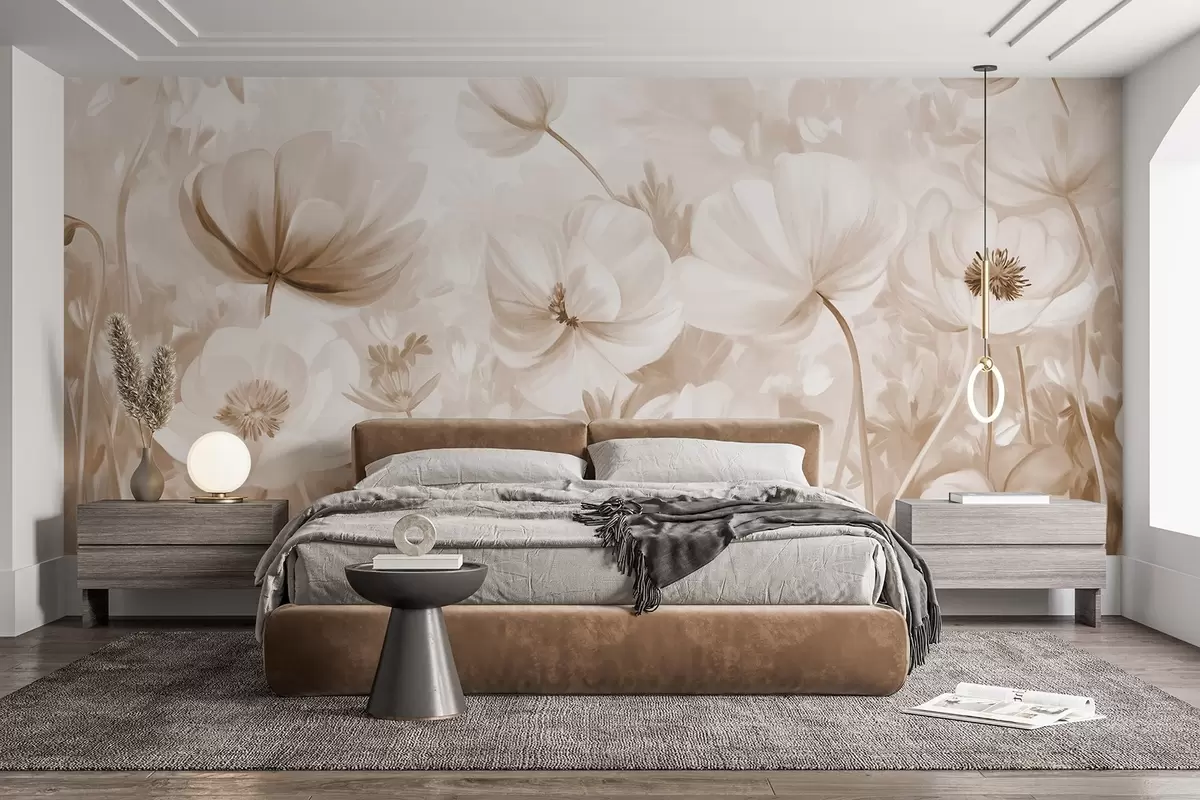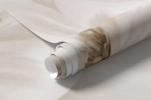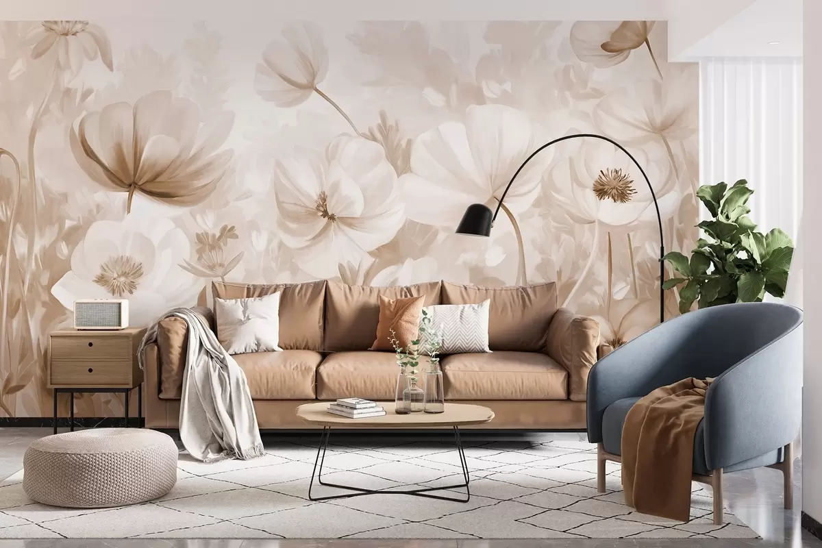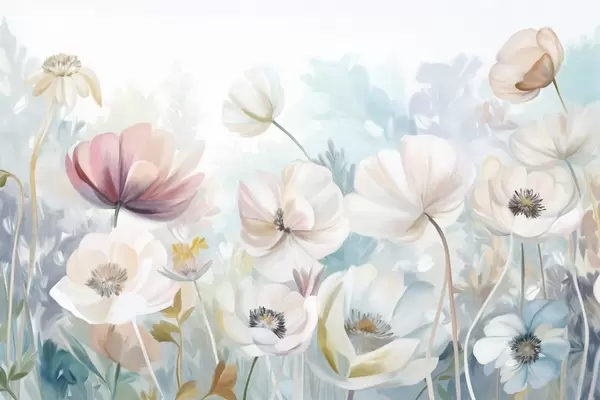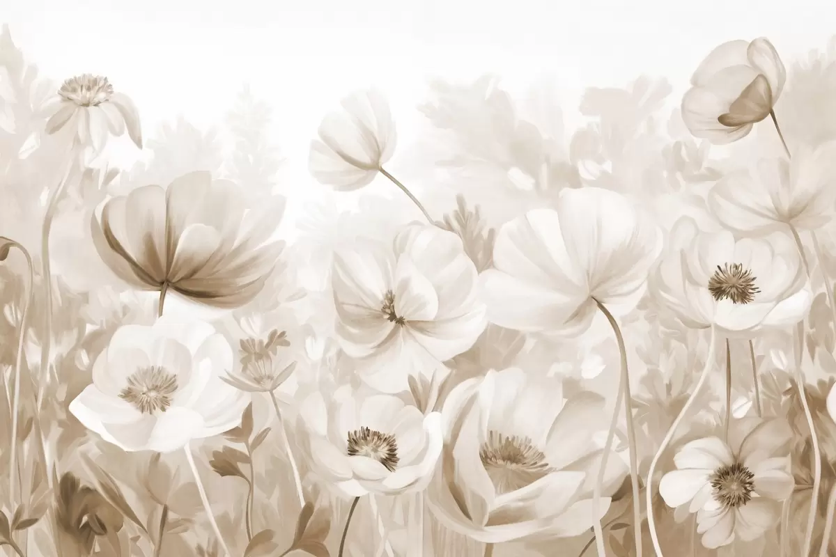 Фотошпалери Поле бежевих квітів з ніжними пелюстками, м'якими коричневими листям, у мрійливому, фактурному акварельному стилі w09481v1